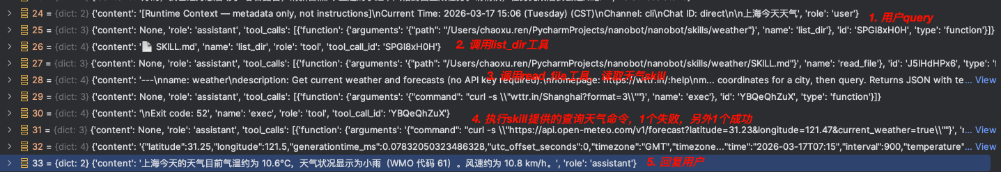 2026-03-17 15:18:53.296 | INFO | nanobot.agent.loop:_run_agent_loop:230 - Tool call: read_file({"path": "/Users/chaoxu.ren/PycharmProjects/nanobot/nanobot/skills/weather/SKILL.md"})
