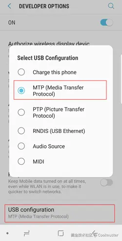 点击手机上的通知栏,然后在 USB 使用窗口中选择MTP或传输文件。