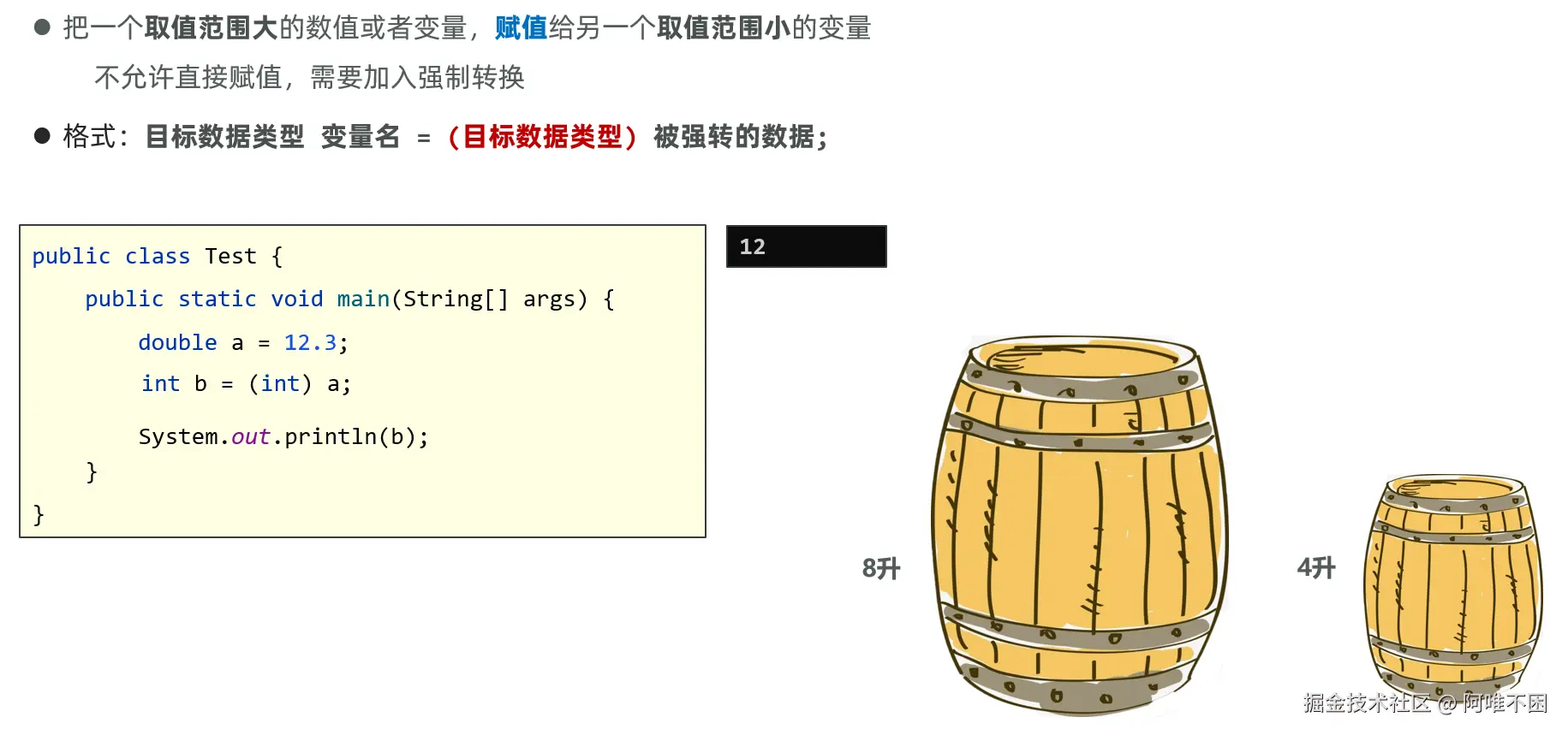 // 输出结果为22,因为相加之和的22.3赋值给 a ,a 变量为 int 类型,强转后砍掉小数点,结果为22