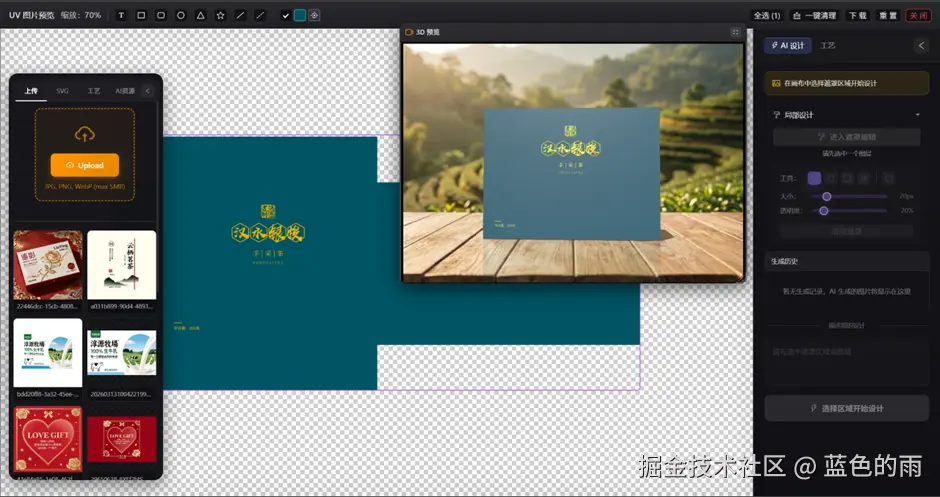 - 🎨 AI 图案生成:输入文字描述,自动生成创意包装图案。