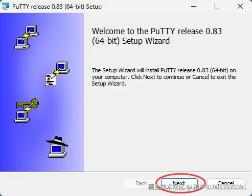 1)完成putty下载后,双击启动安装程序。安装文件名为 putty-64bit-0.83-installer.msi(也有32位版本的)。