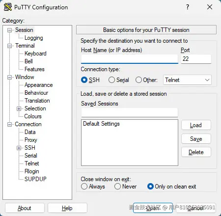 5)安装完成后,可以在开始菜单或桌面上找到 PuTTY 图标。首次运行 putty 时,会显示简洁的配置界面,用户可以立即开始配置远程连接。