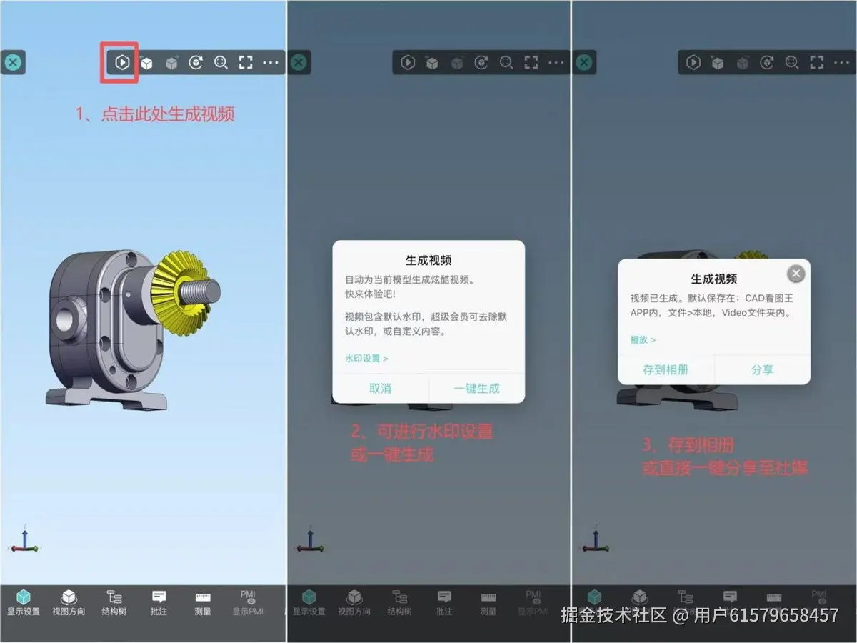1.1三步成片: 用CAD看图王app打开三维图纸→点击导出按钮→获取视频,彻底剥离视频剪辑、参数调整等专业技术门槛。