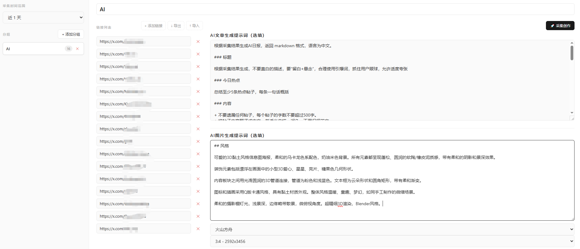 那么如何能让 AI 一次性自动生成上面的文章和图文呢,这里就用到了豆豆的图文创作。 我这里抓取的是 X.com 的 AI 相关创作者,只需要要在图文创作中输入对标的网址,配置抓取的时间范围,如近一天,再编写自己风格的文章、图片提示词,点击采集创作,剩下的全部交给豆豆自动处理。