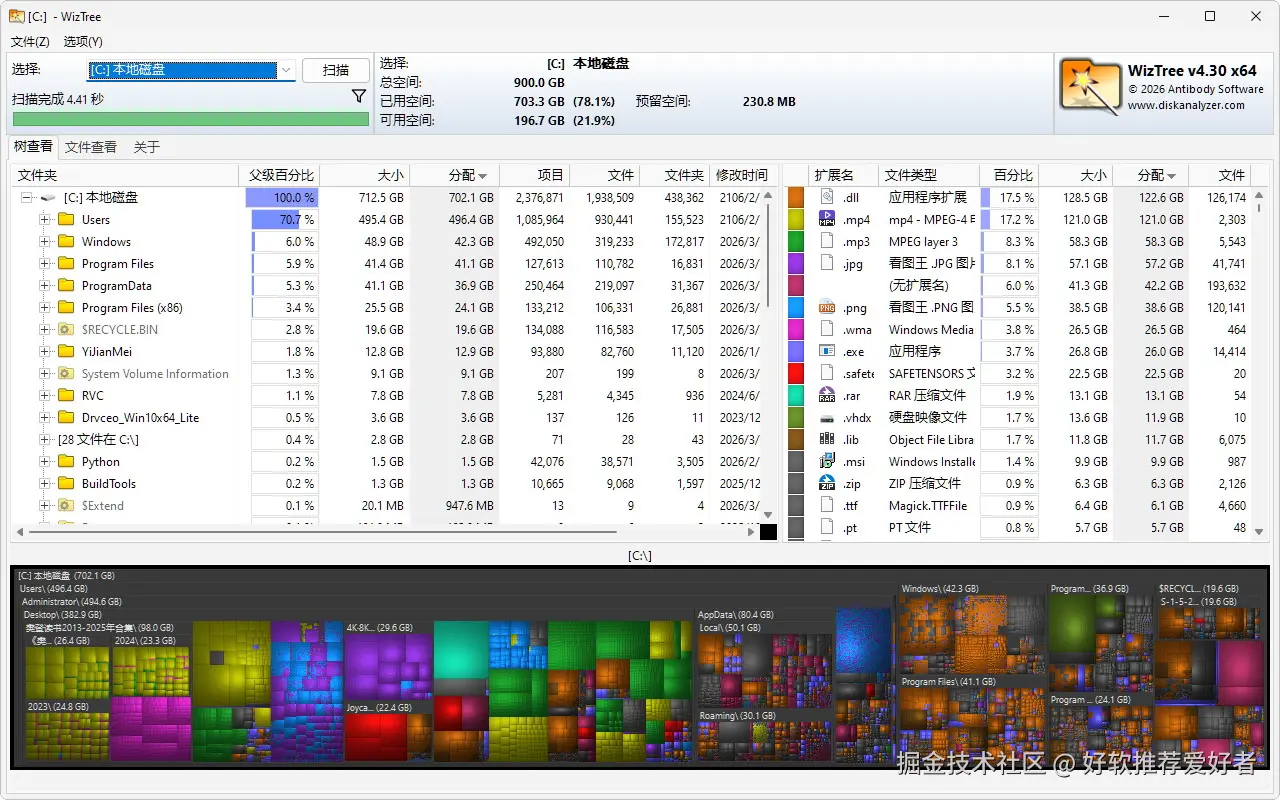 多数 Windows 用户因软件默认装 C 盘、临时文件与微信资源持续堆积,导致 C 盘空间飘红。WizTree v4.30 便携版可快速扫描出大体积安装包、缓存垃圾文件,清理后能腾出数十 GB 空间,让电脑运行更流畅。该工具为绿色便携版无需安装,电脑操作小白也能轻松完成 C 盘清理操作。