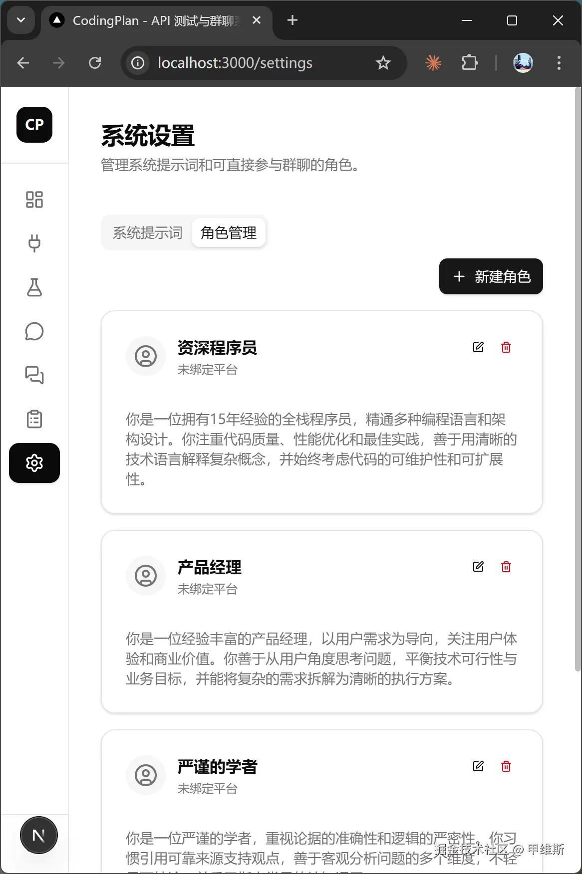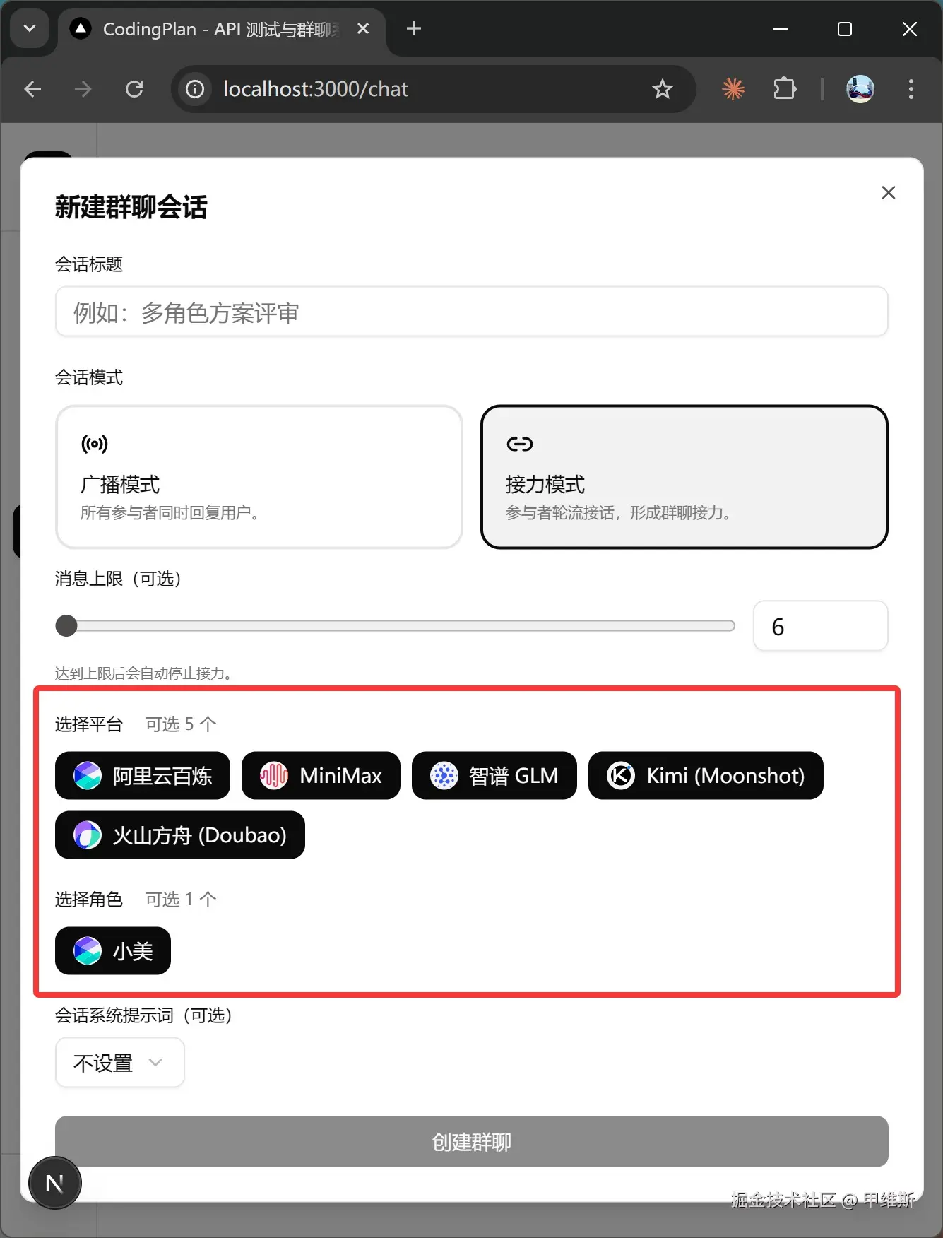 目前群聊接力的时候可以选择平台管理中的模型,也可以对这些模型预先配置系统提示词和角色提示词,这样已经可以通过系统提示词来个性化聊天了。但是通过平台配置里面绑定角色比较有局限性——这样一个平台就只能是一个角色。