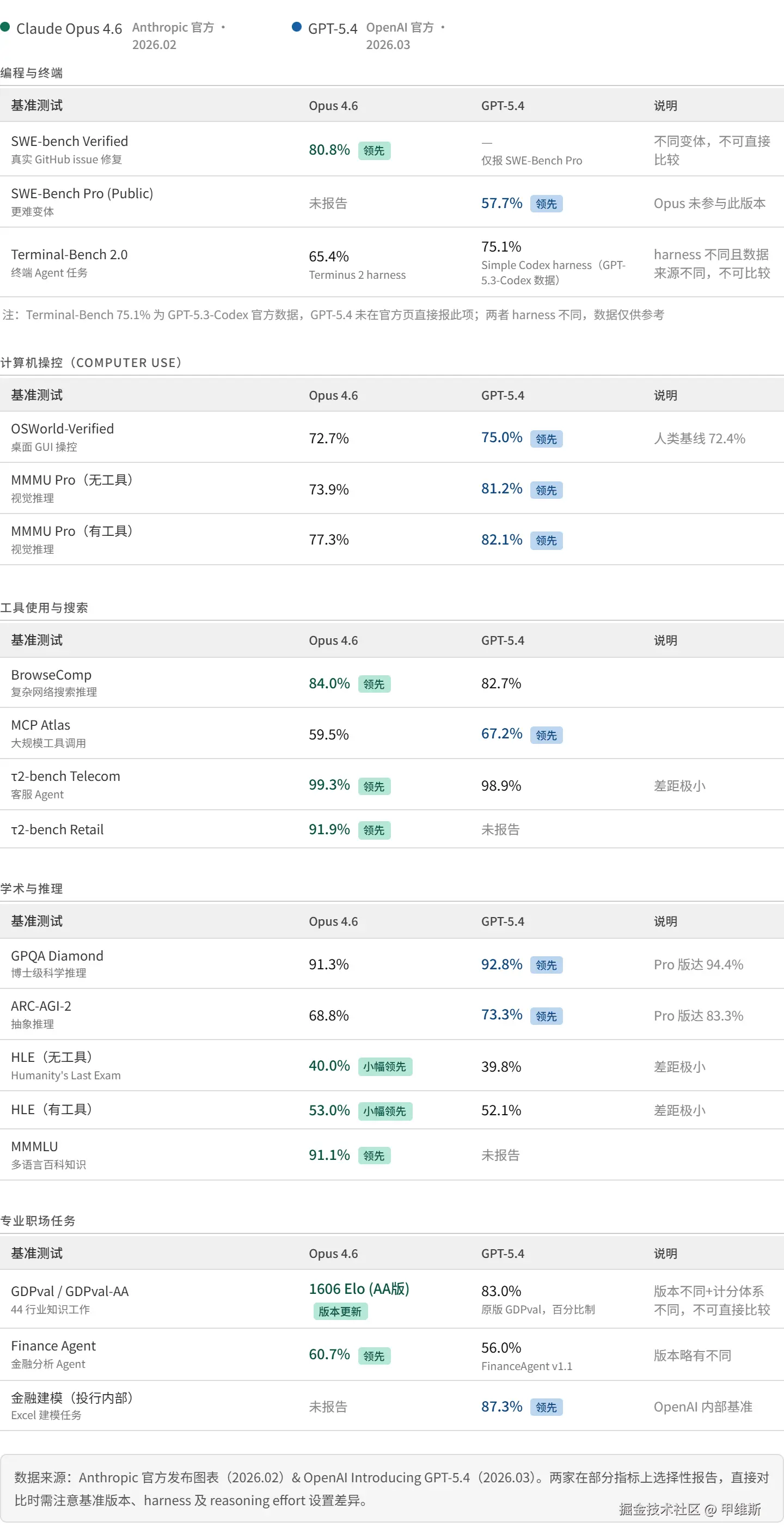无论内网外网,都有人觉得 GPT5.4 要比 Opus4.6 强,当然也有人觉得 Opus4.6 明显要比 GPT5.4 强!