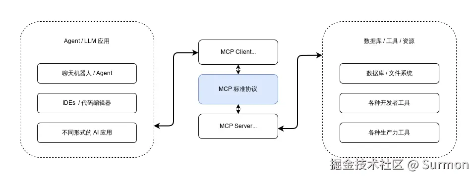 - MCP 集成模式:模型 ↔ MCP 协议 ↔ 任何支持 MCP 的工具。