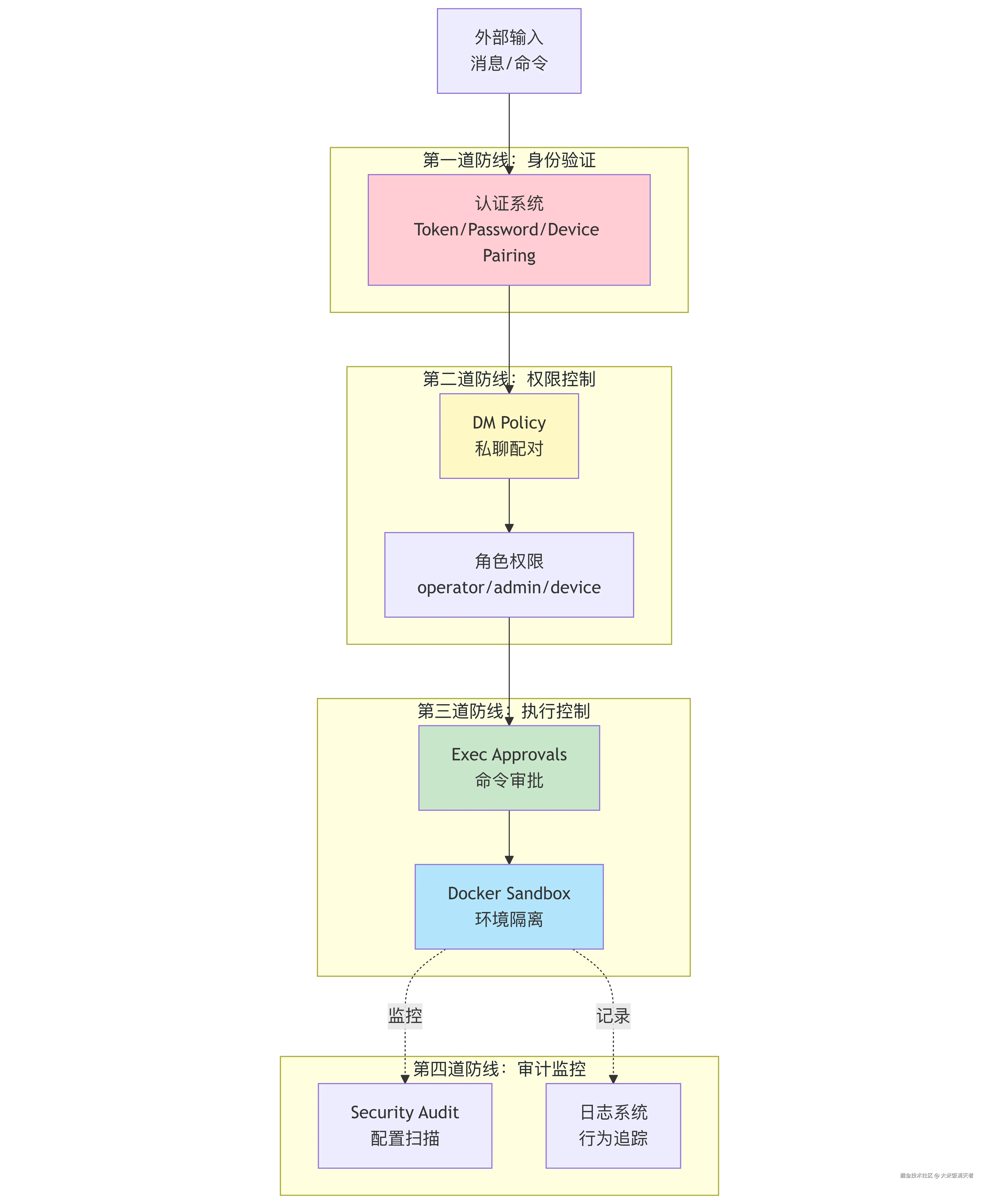 原理:OpenClaw 内置安全扫描工具,自动检测配置风险。