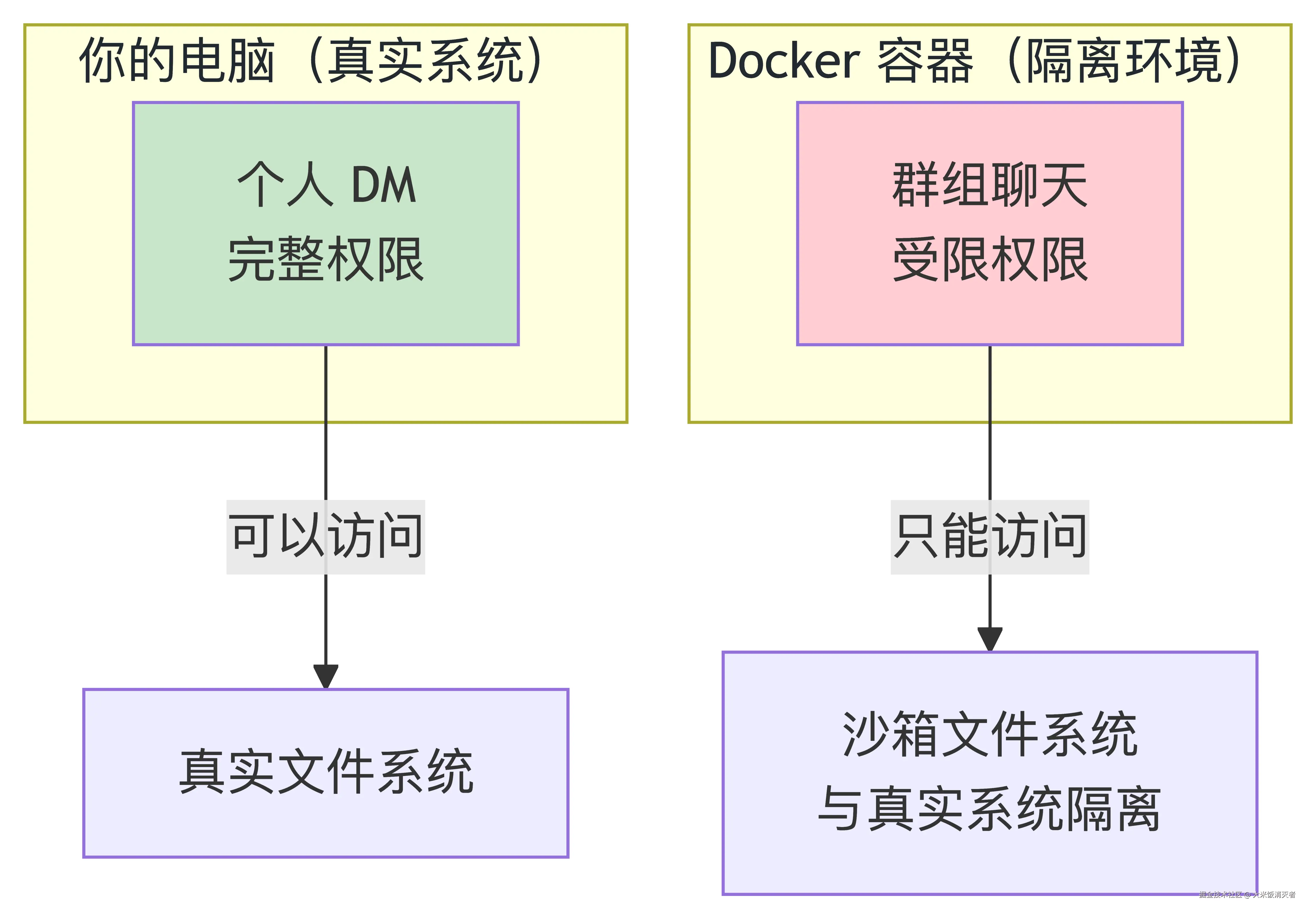 原理:在群组聊天中,AI 在隔离的 Docker 容器中执行命令,无法访问你的真实文件。