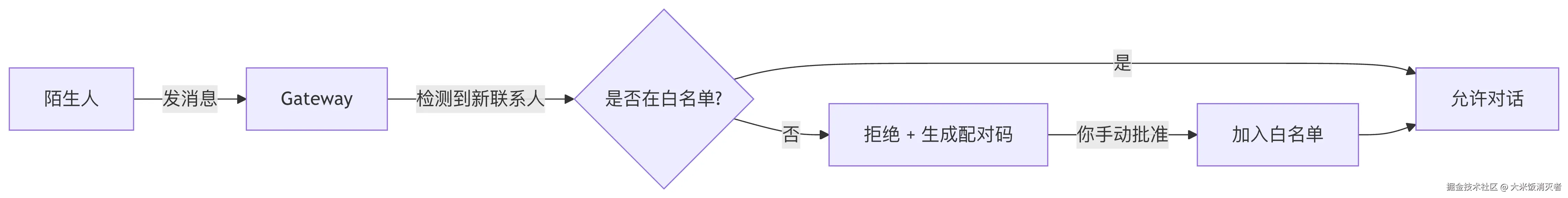 - 陌生人发消息 → OpenClaw 生成 6 位配对码