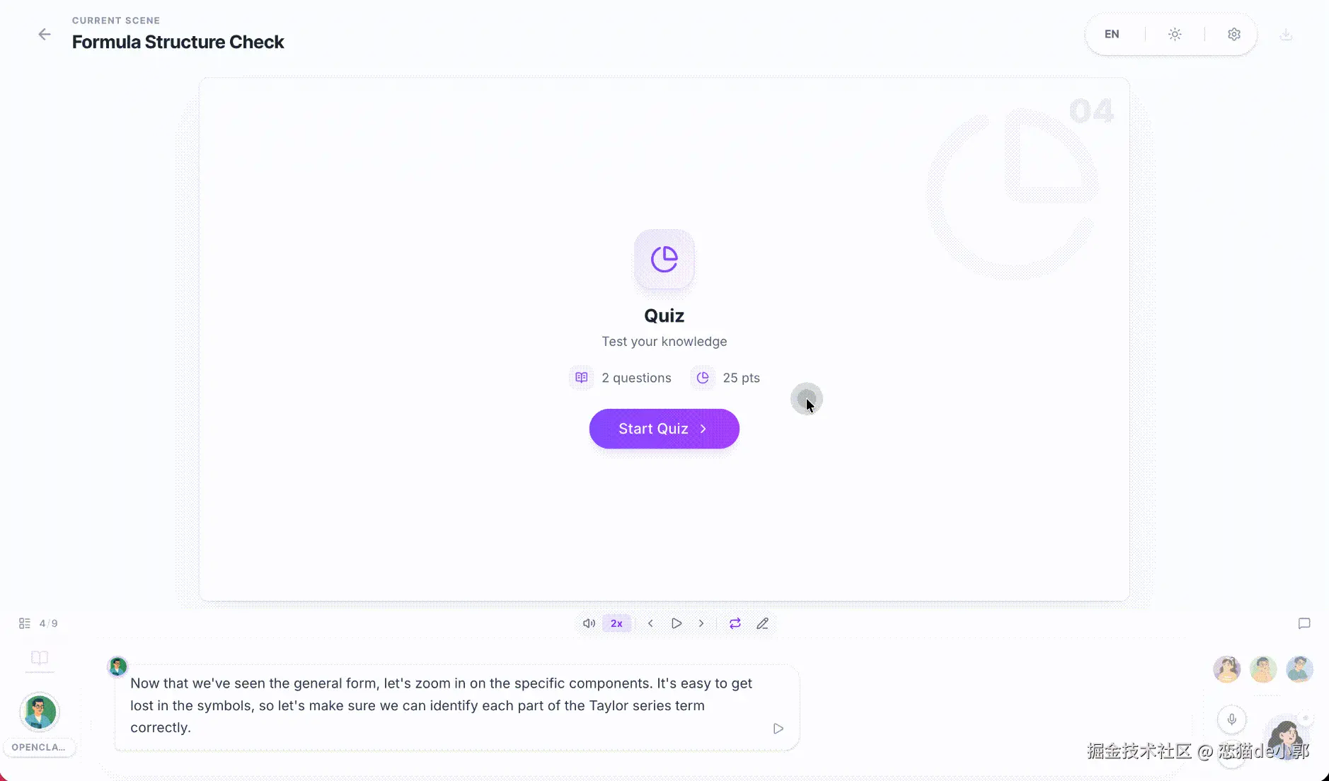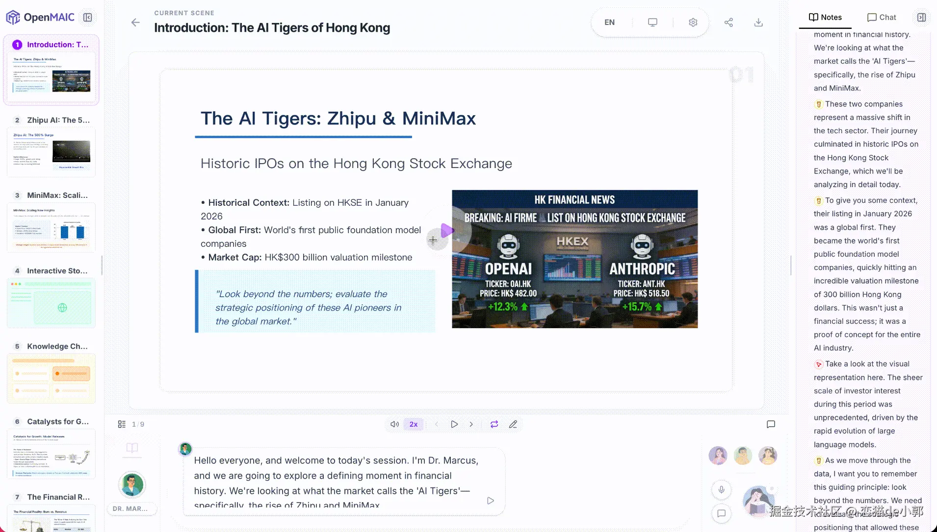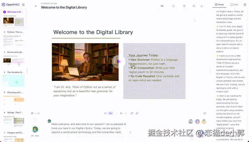 也就是,你给它一个话题或者丢给它任何学习材料,它就能自动生成一堂完整的 AI 互动课, 甚至可以有 AI 老师给你讲,有 AI 同学跟你讨论,还能导出课件,最重要还能和 OpenClaw 适配,例如: