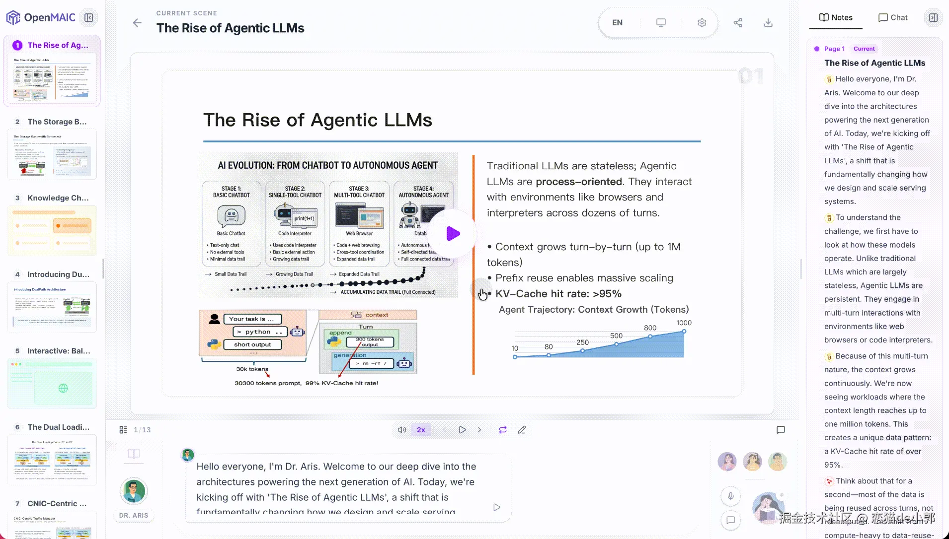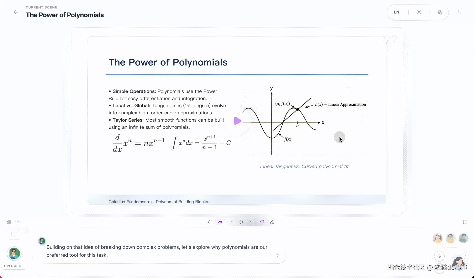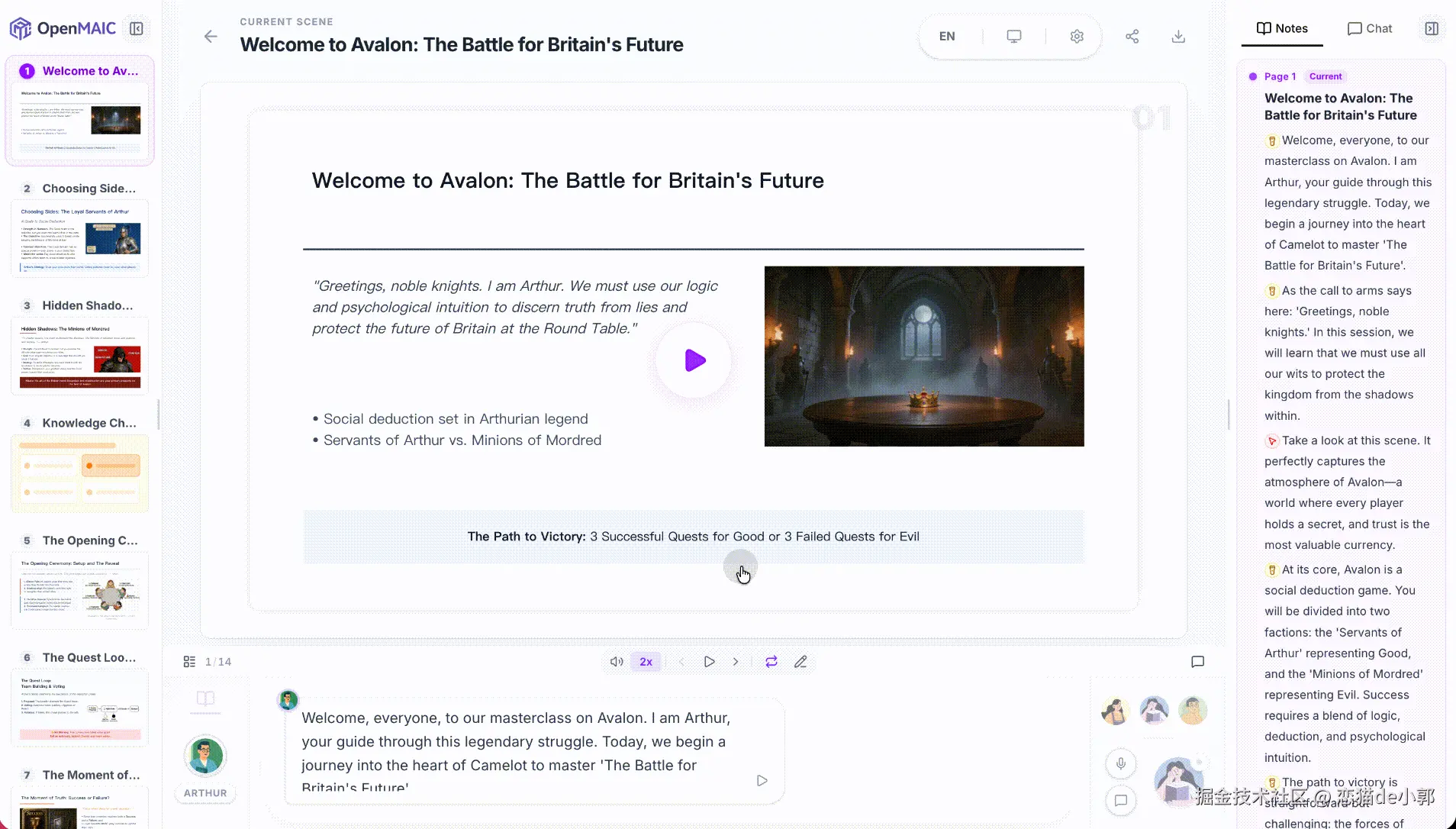 - 阶段二场景生成:根据大纲的每个条目,自动生成对应的场景内容(如幻灯片、测验题等),并为每个场景配置特定的 AI 动作(如语音脚本、白板绘图指令)