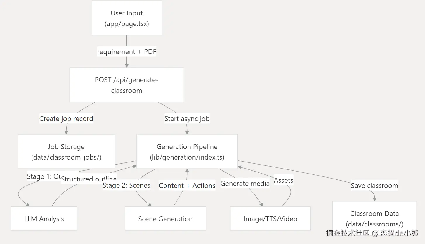 而整个核心架构主流程为是基于 Job 来实现,生成对应 Job ,然后分析需求和 PDF 文件,生成结构化大纲,每个大纲项目都会扩展成一个完整的场景,包含幻灯片、教学动作和媒体: