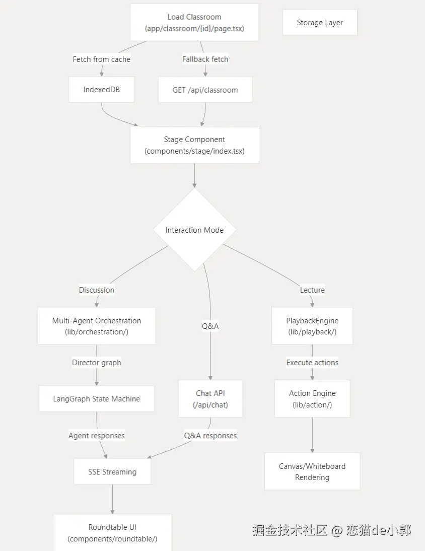 而对应的多智能体编排引擎实现(lib/orchestration/ )通过 Director Graph 来协调课堂中的对话流: