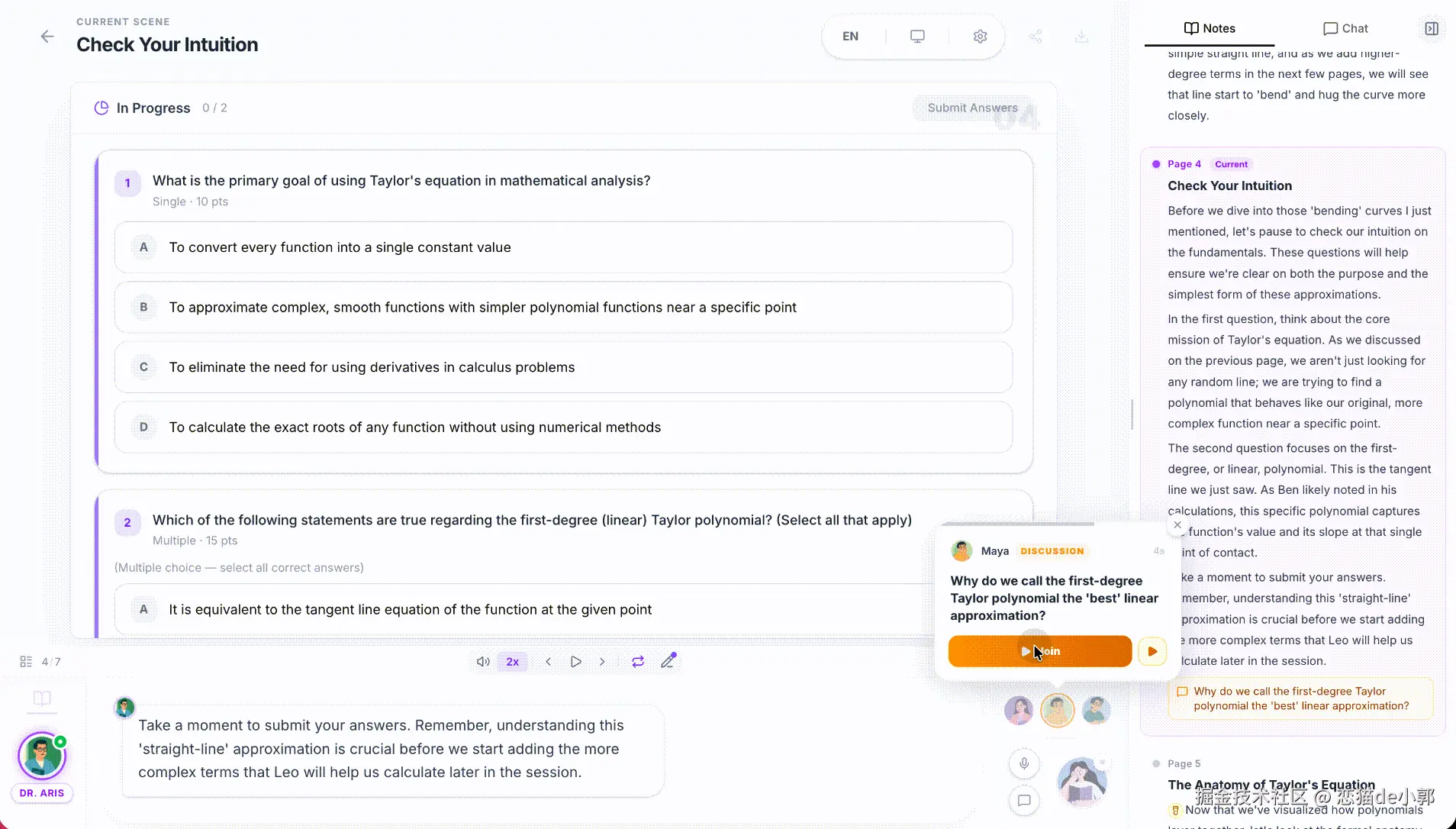 - 课堂讨论:Agent 主动发起讨论话题,用户可以随时加入或被点名互动圆桌辩论,用多个不同人设的智能体围绕话题展开讨论,配合白板讲解自由问答,AI 通过幻灯片、图表或白板进行解答白板 , Agent 在共享白板上实时绘图,逐步推导方程、绘制流程图、直观讲解概念
