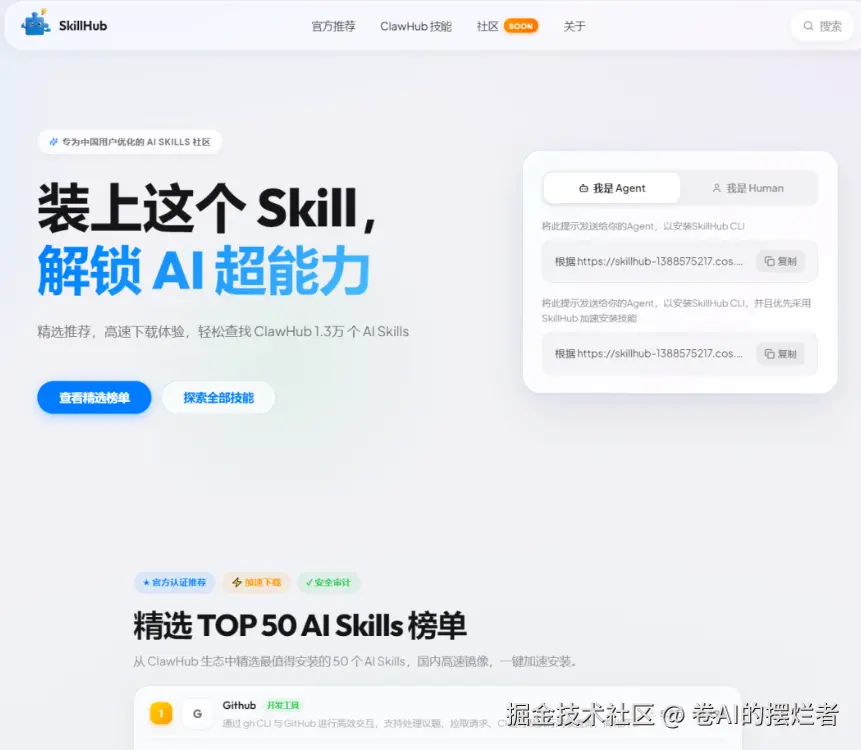 文章提到的 SkillHub 精选榜单和 Top50 清单确实有用,但还不够完整。