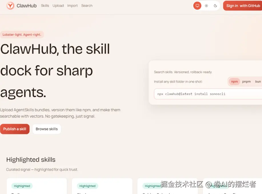 它是一个开放的 Skill 聚合生态,任何开发者都可以把自己写的技能发布上去。