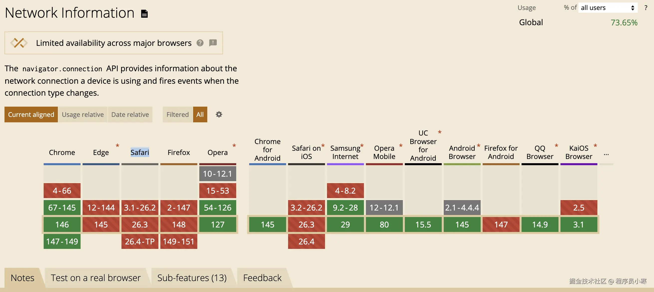 但 navigator.connection 存在两个问题,第一个是兼容性很差,像 Edge、Firefox、Safari 这种主流浏览器都不支持。