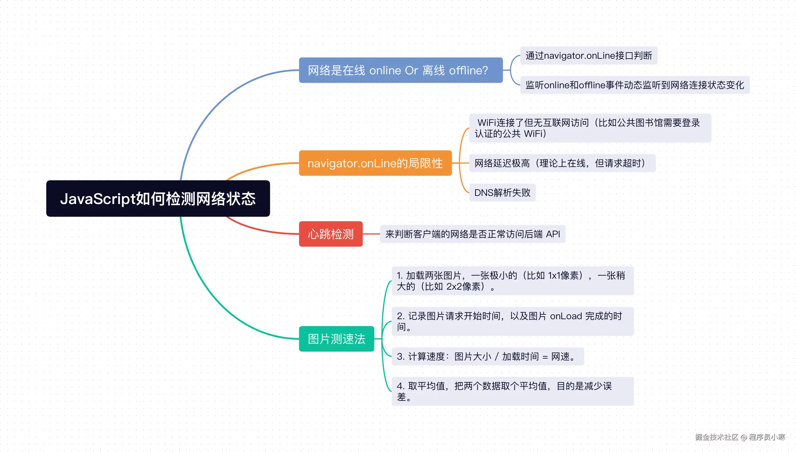 navigator.onLine存在一定的局限性,比如无法识别到 WiFi 连接了但无互联网访问、网络延迟极高、DNS 解析失败等情况,我们还需要通过心跳检测方案来判断客户端是否能正常访问后端 API。 navigator.connection虽然能拿到用户的网络下行速度downlink,但connection接口存在兼容性和数据不准的问题,所以我们需要用图片测速法来更加准确地拿到用户网速情况。