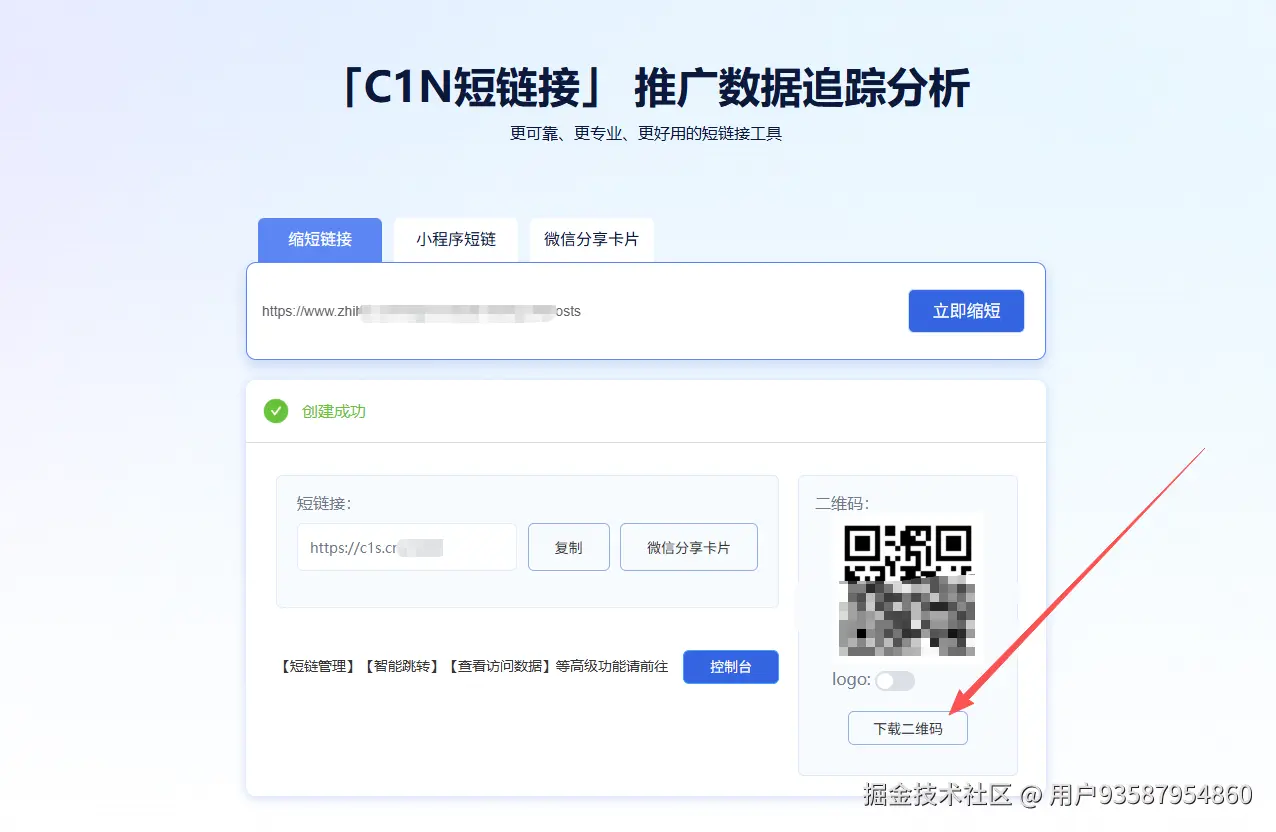 在C1N短链接首页(c1n.cn)首页输入任意原始链接,点击【立即缩短】,即可得到一个短链接+简化过的高清二维码。