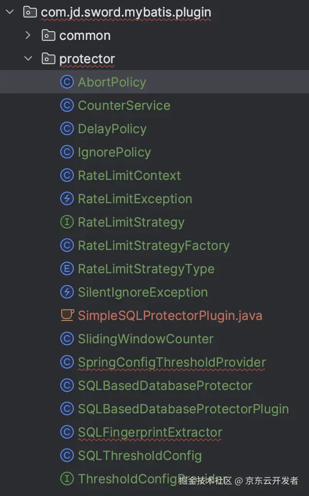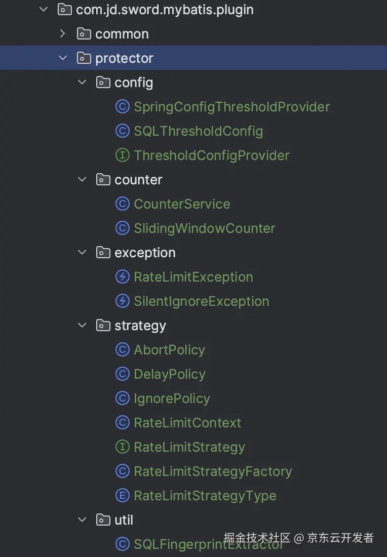在 com.jd.sword.mybatis.plugin.protector 包下,目前是很多类平铺的,需要分一下子包,比如按照策略类、Exception类、计数类相关分包,并把相关的类移入新包中,com.jd.sword.mybatis.plugin.protector.SQLBasedDatabaseProtectorPlugin 的位置不用动