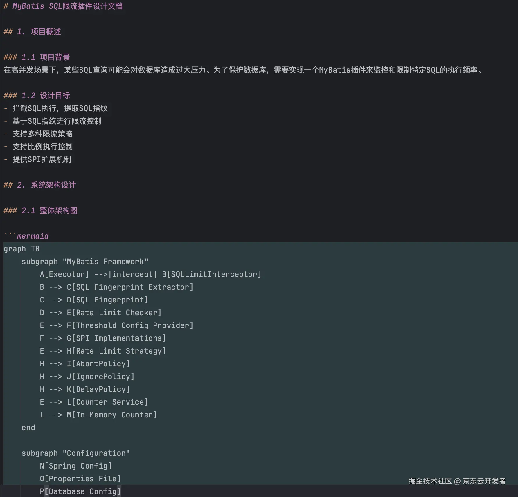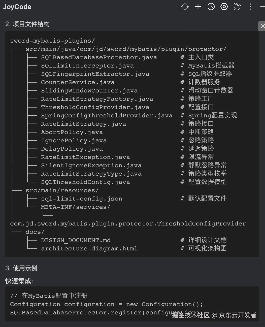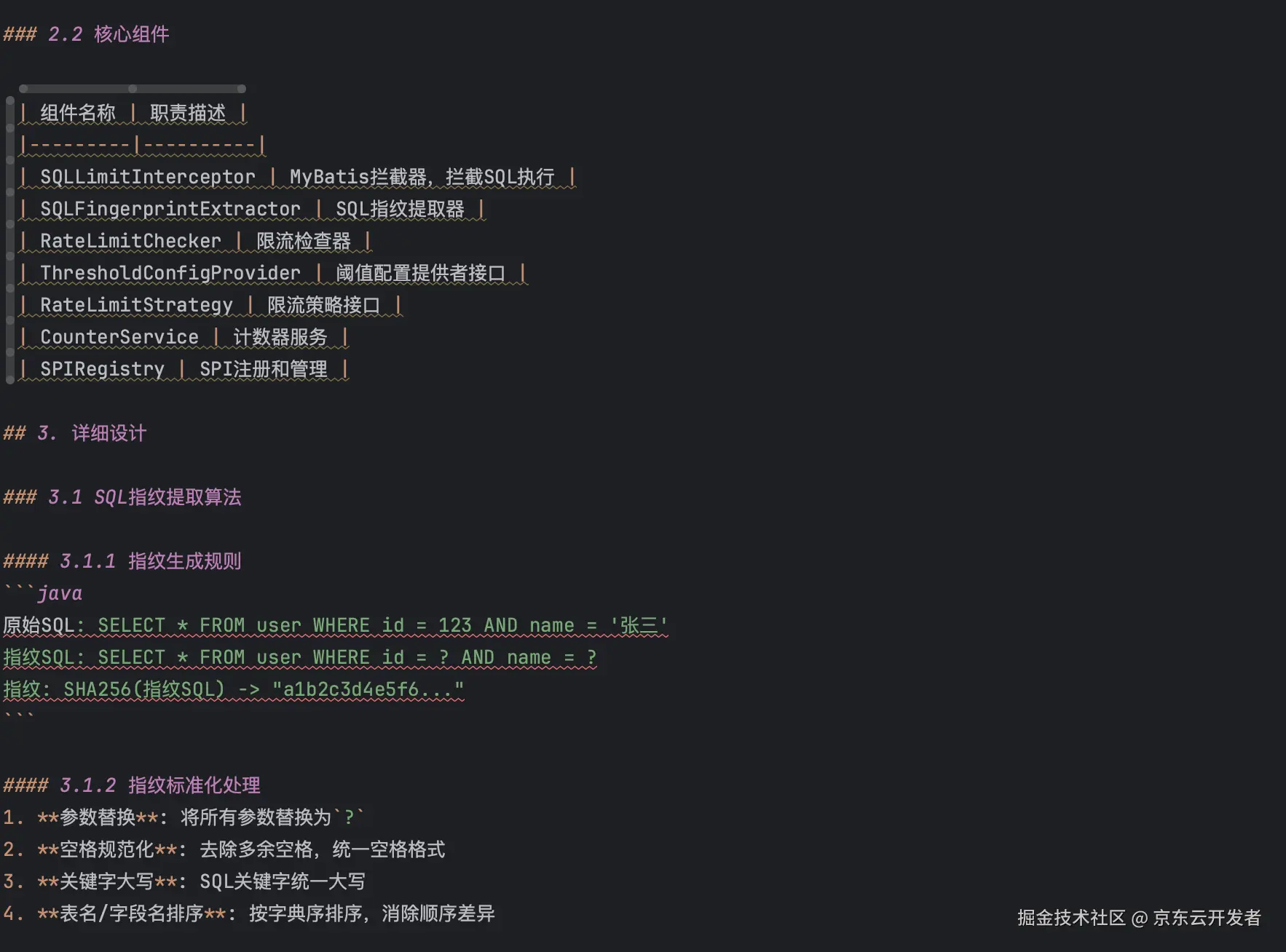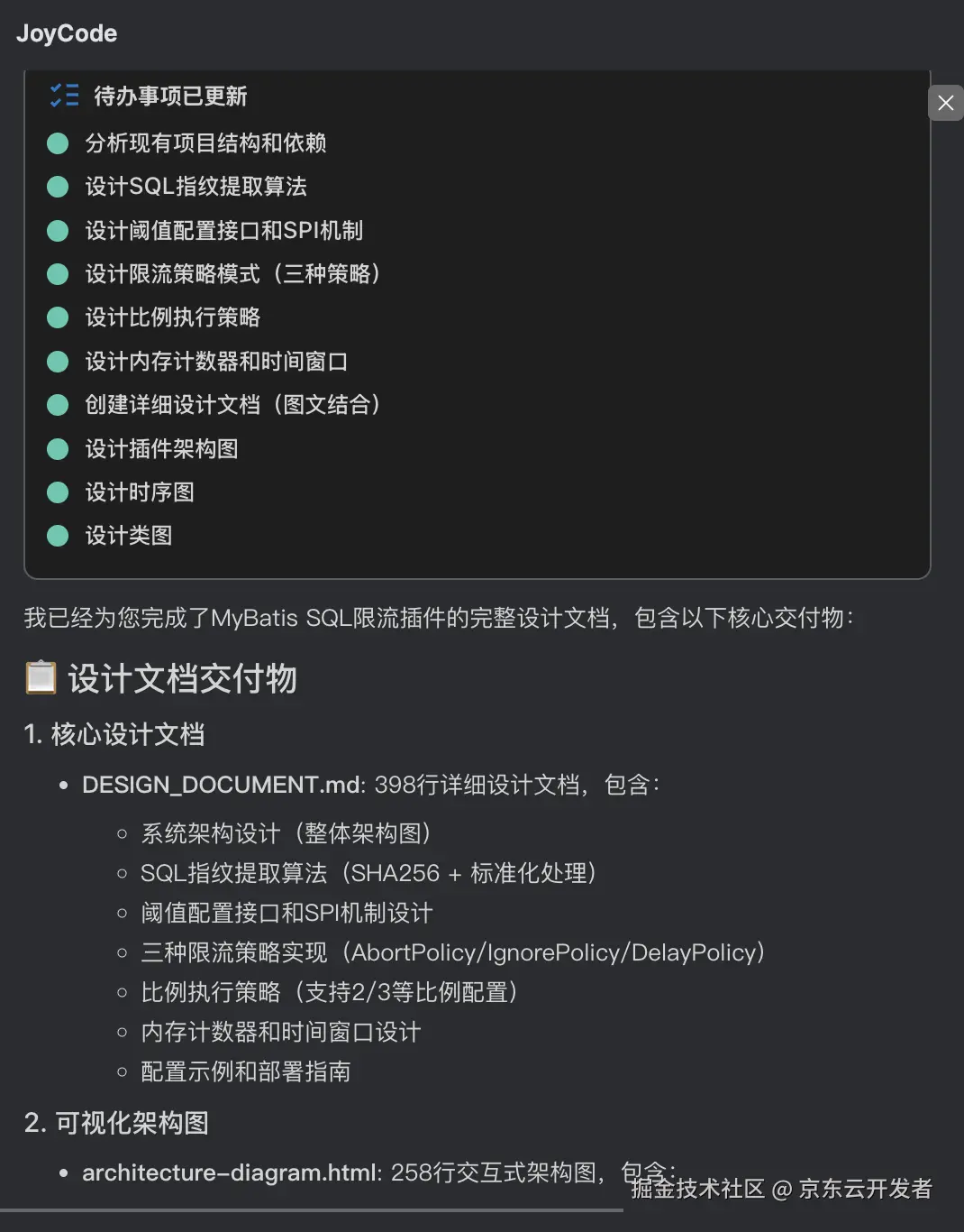 设计文档中除了我给出的规划意图,还包含joycode所展开的具体实现细节,包含类的规划、限流具体算法、SQL指纹的生成逻辑、SPI的接口定义、限流保护策略的定义和实现等。整体看来设计方向没问题,按此实现落地。