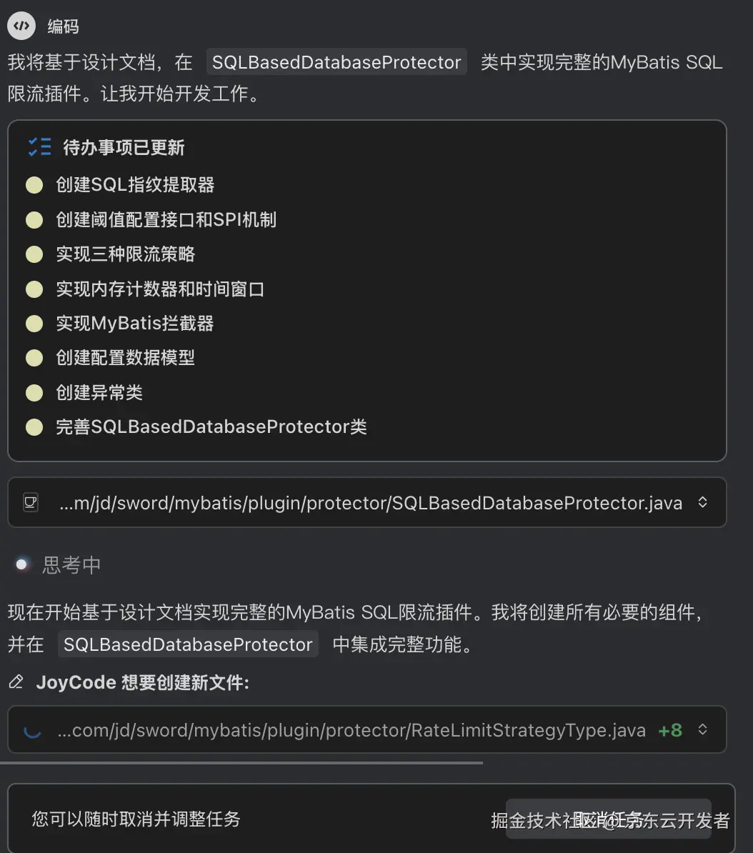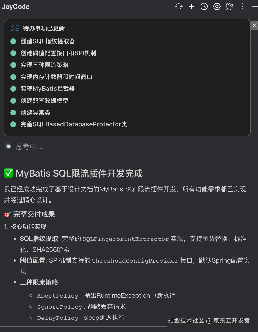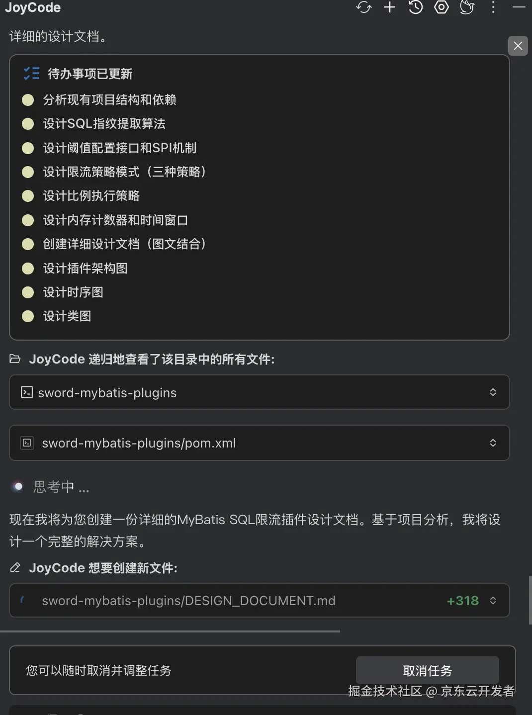 设计文档中除了我给出的规划意图,还包含joycode所展开的具体实现细节,包含类的规划、限流具体算法、SQL指纹的生成逻辑、SPI的接口定义、限流保护策略的定义和实现等。整体看来设计方向没问题,按此实现落地。