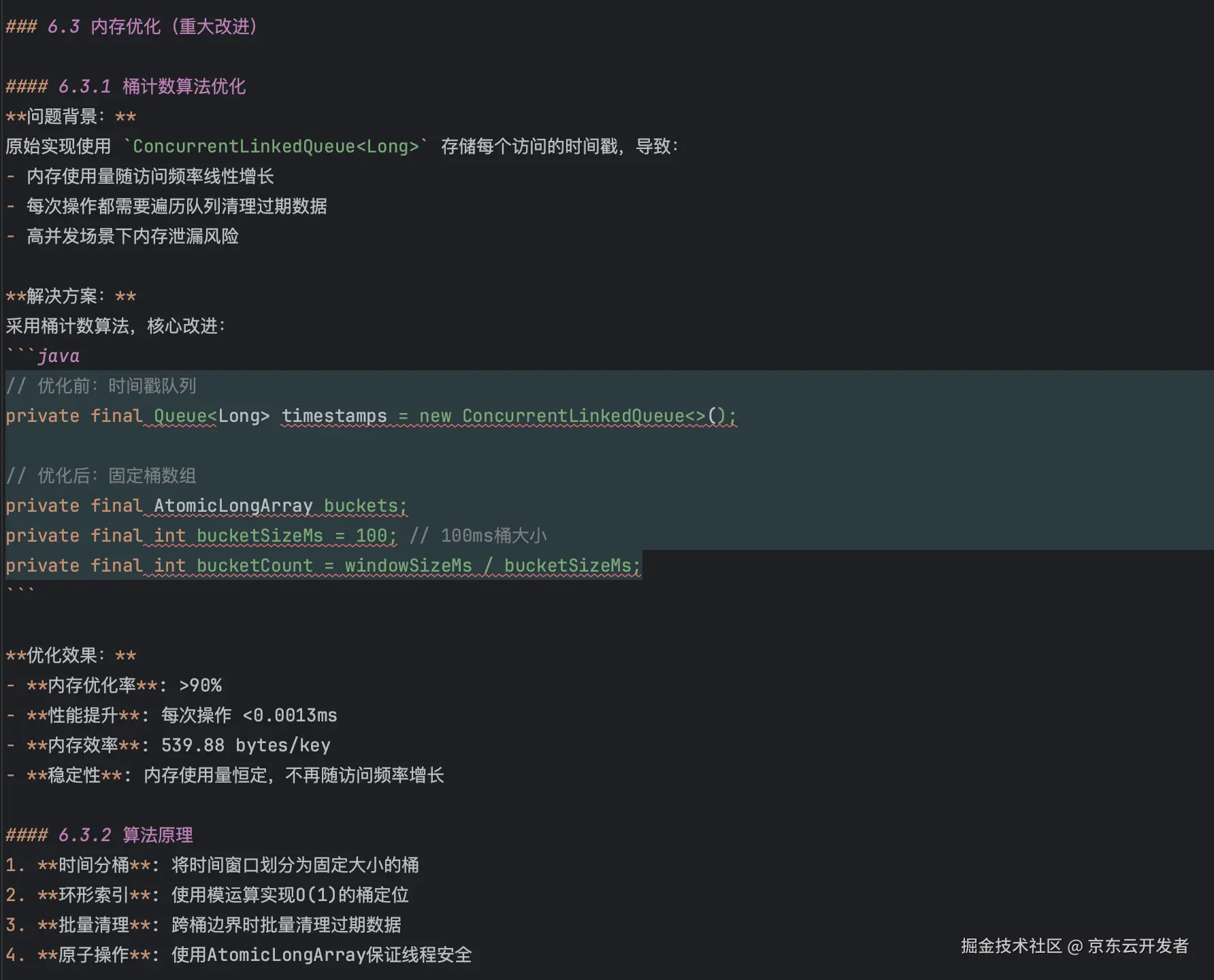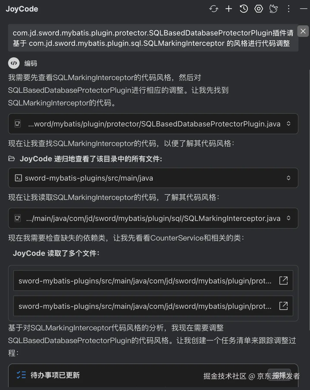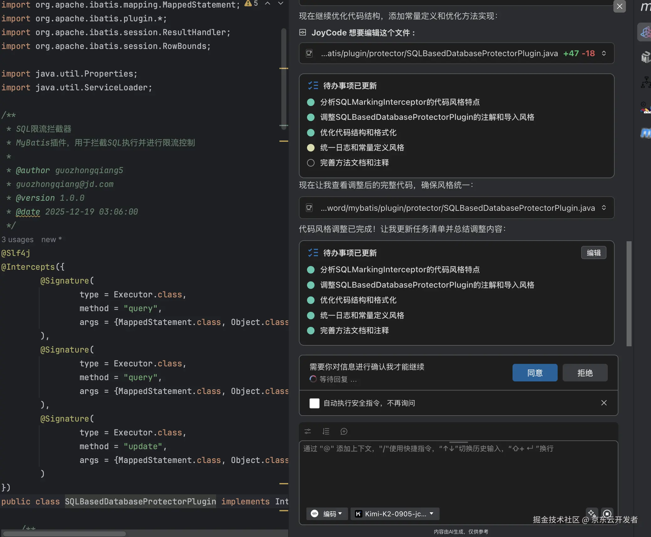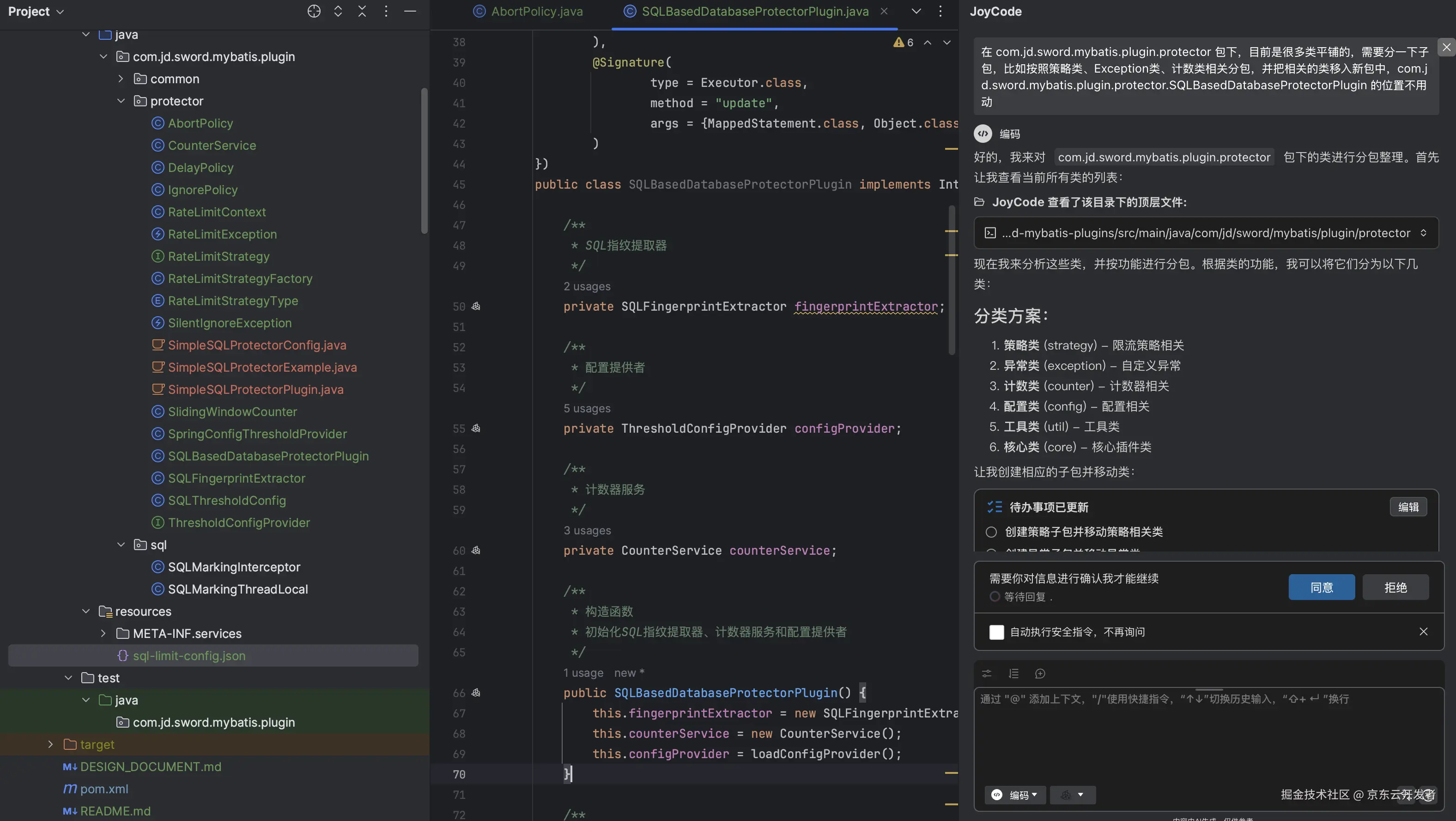 设计文档中除了我给出的规划意图,还包含joycode所展开的具体实现细节,包含类的规划、限流具体算法、SQL指纹的生成逻辑、SPI的接口定义、限流保护策略的定义和实现等。整体看来设计方向没问题,按此实现落地。