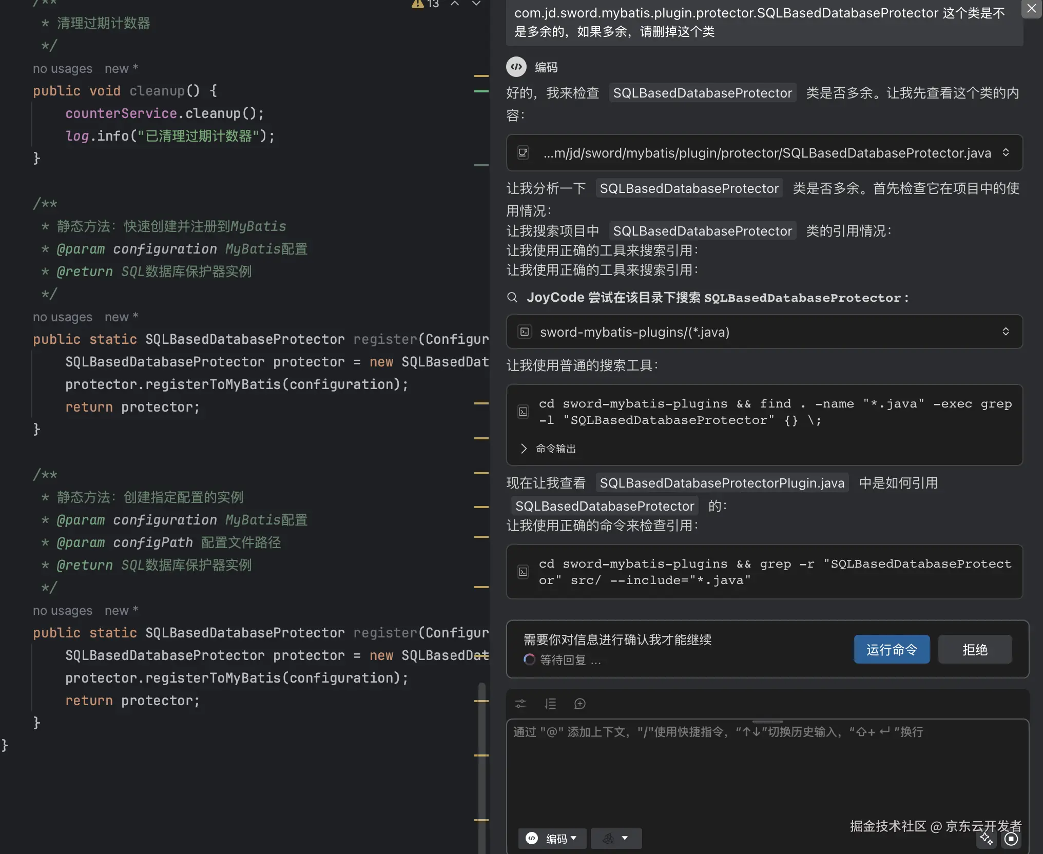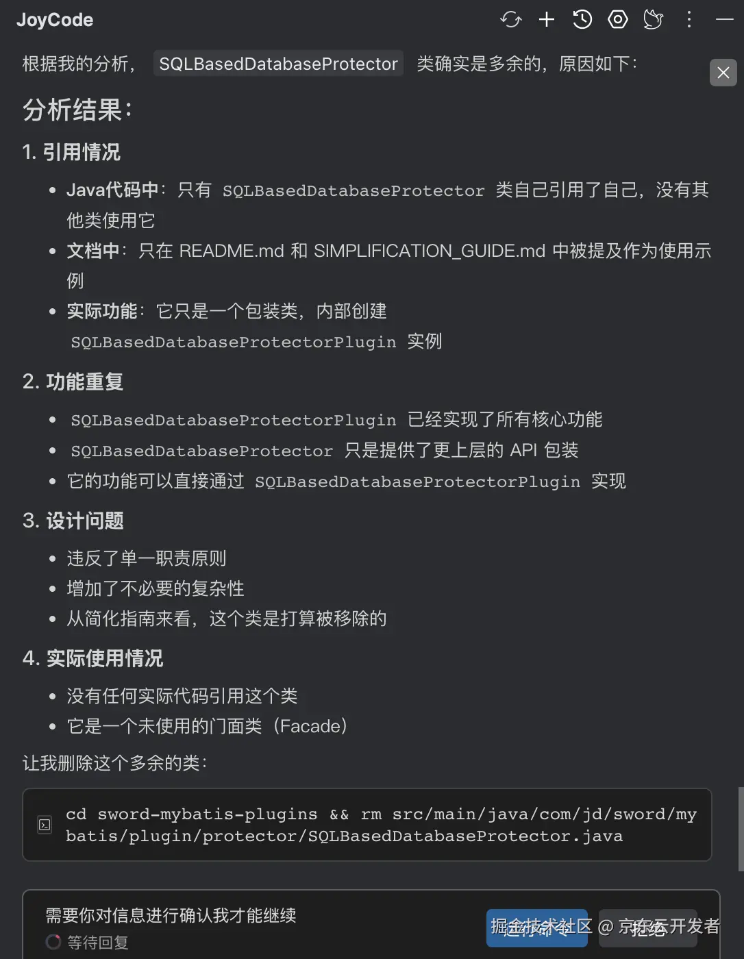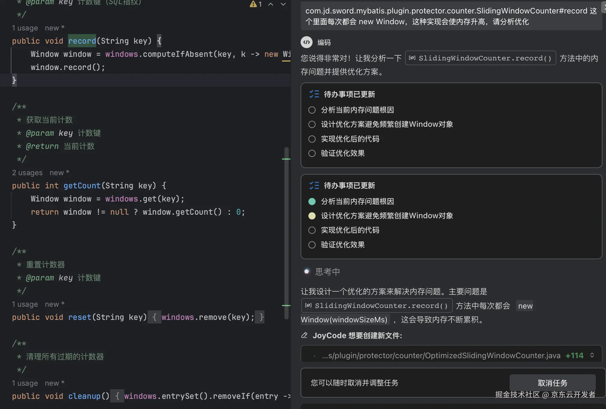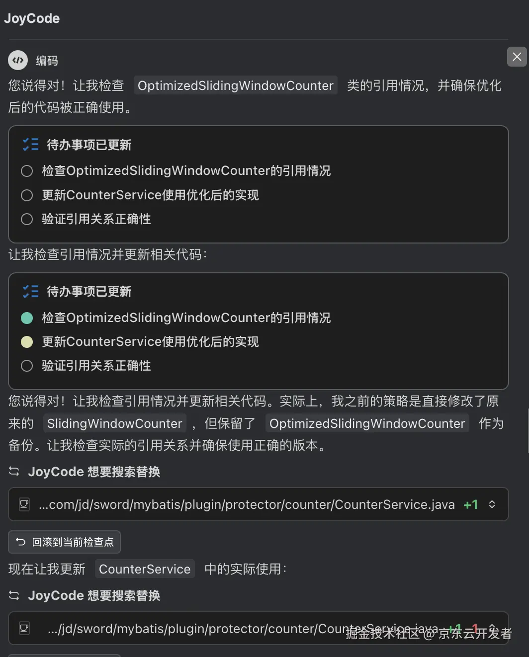在分包优化这块,因为拆分了很多子包,类的package需要调整,引用import也需要调整,joycde也识别到了工作的复杂性,尝试写批量脚本处理,因为来回处理了一会,比较费时,我感觉人工处理更快,选择停止任务,人工调整包。