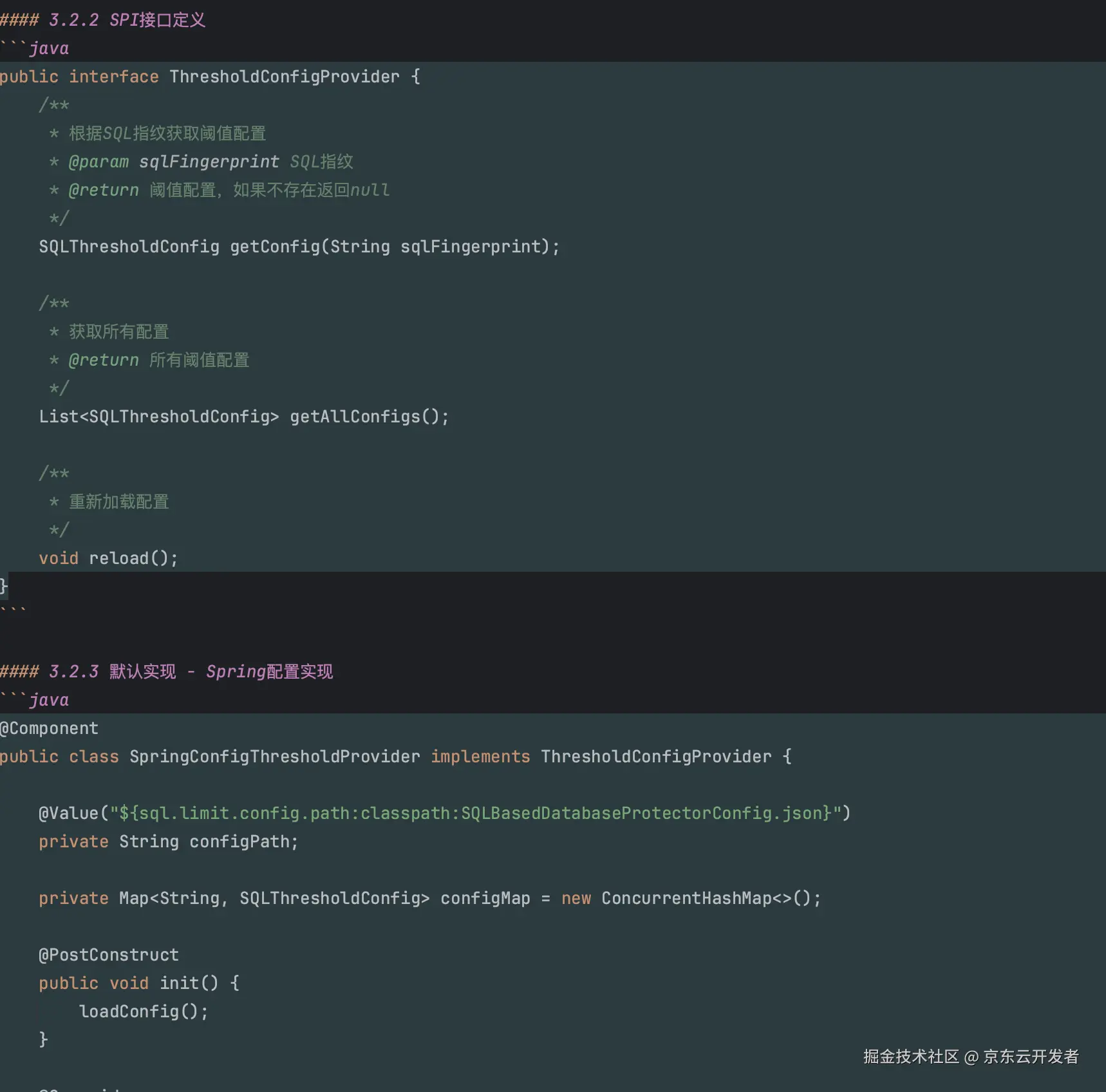 2、定义接口,从中基于SQL指纹查询配置的阈值,该接口的默认实现是通过Spring配置文件加载该SQL指纹的阈值,还可以有其他实现,交给该插件的接入方来实现,通过 ServiceLoader SPI方式进行加载具体实现
