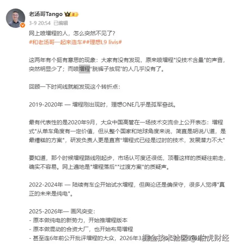 三月初,理想的产品线负责人老汤哥发了一条微博,调侃了一下增程路线从“过时技术”到厂商纷纷布局“真香”的转变。这里暂且不讨论技术的高下之分,增程的普及其实揭示了一个行业法则,在面向用户的宣传里,解释成本越低,实际收益越高。