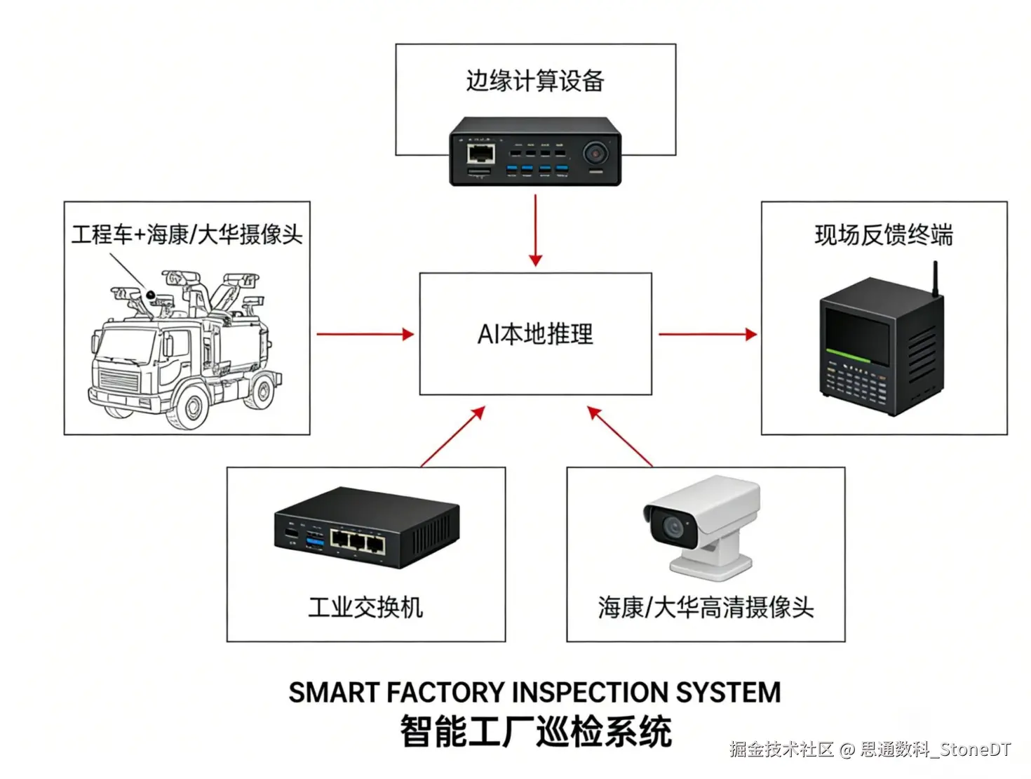 地面端 工程车在厂区内移动巡检,搭载的海康、大华等品牌高清摄像头实时捕捉管道泄漏、消防设施故障、违规作业、通道堵塞等问题,NVIDIA Jetson AGX Orin边缘计算设备本地快速推理,即时向现场工作人员反馈结果,确保隐患第一时间被发现。