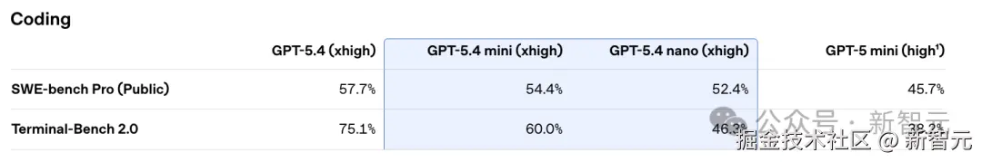 编码(SWE-Bench Pro):GPT-5.4 mini 拿下 54.4%,而满血版 GPT-5.4 是 57.7%;