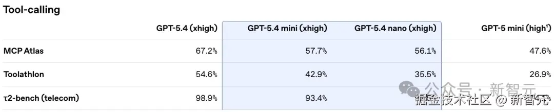 在另一个工具调用基准 MCP Atlas 上,GPT-5.4 mini 拿到 57.7%,而 GPT-5 mini 只有 47.6%。