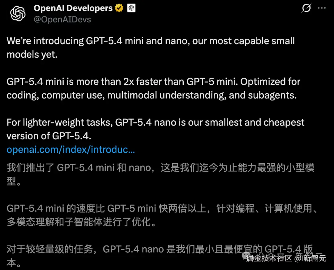 今天,GPT-5.4 mini 和 GPT-5.4 nano 正式发布。