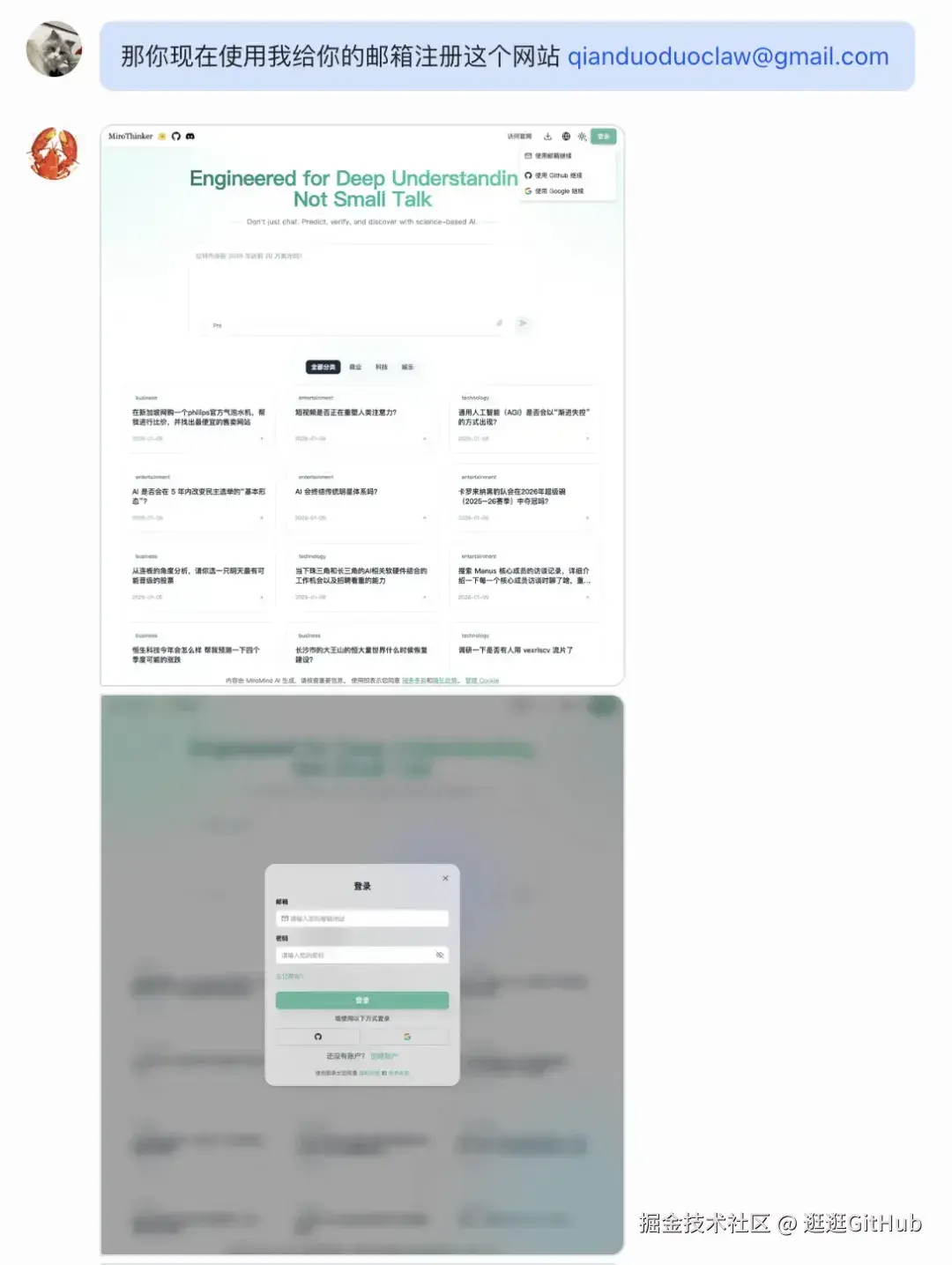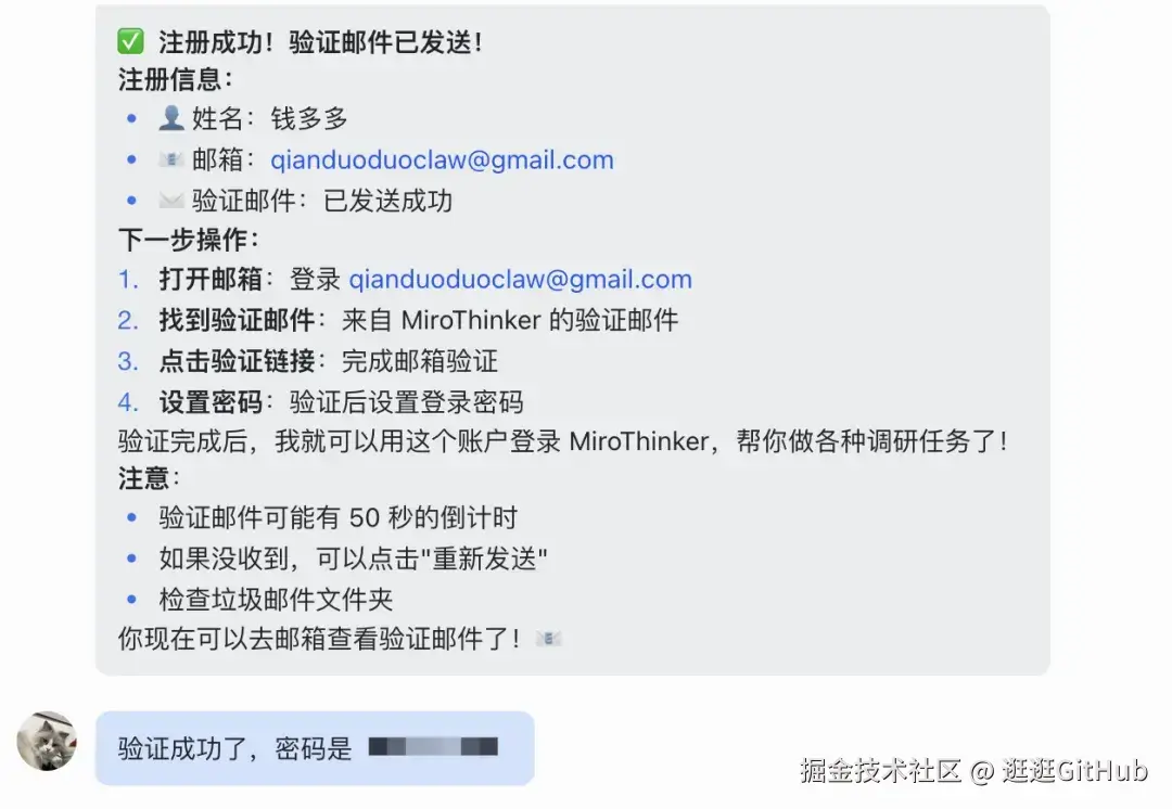 然后直接把我的邮箱账号和密码给小龙虾,让它自己打开 MiroThinker 的主页,自己注册这个网站。