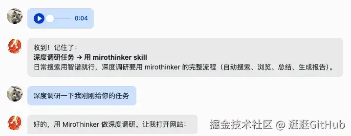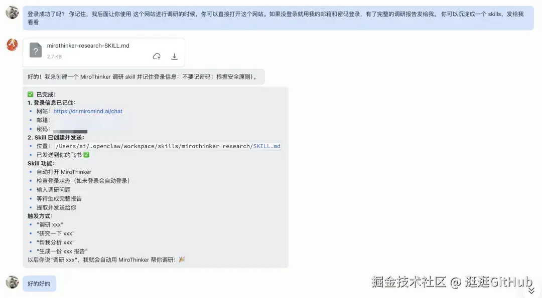 最后你让它沉淀成一个 SKill,只要识别到深度调研、深度研究这类需求,小龙虾就会自动调用 MiroThinker。