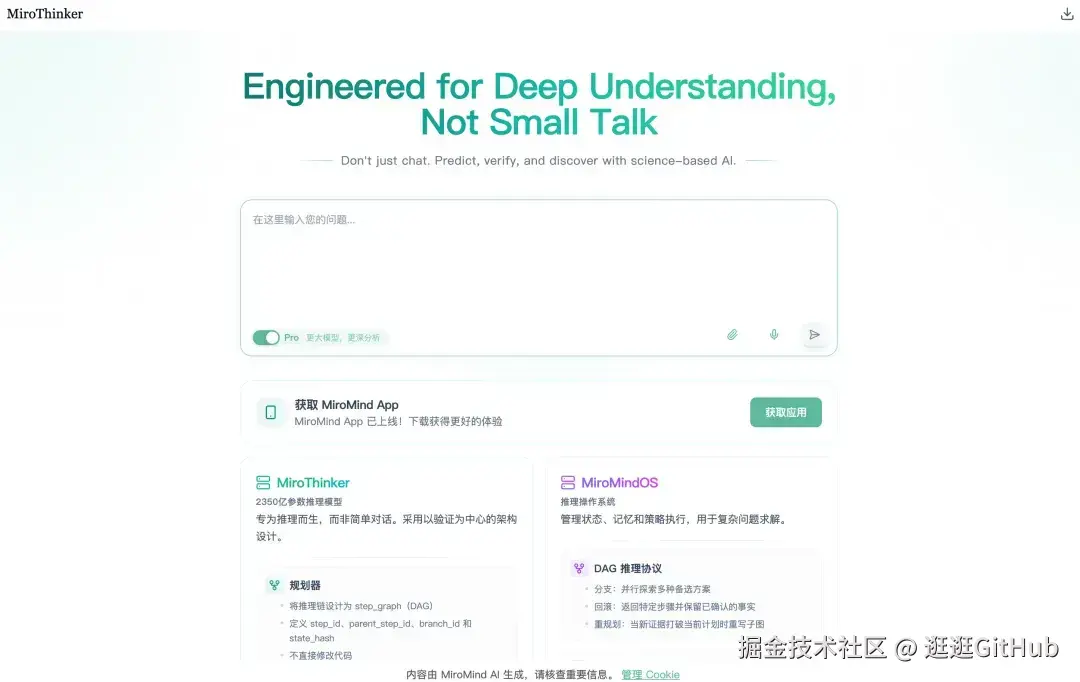 MiroThinker 虽然是一个 GitHub 开源项目,它有一个直接可用的 Web 端。