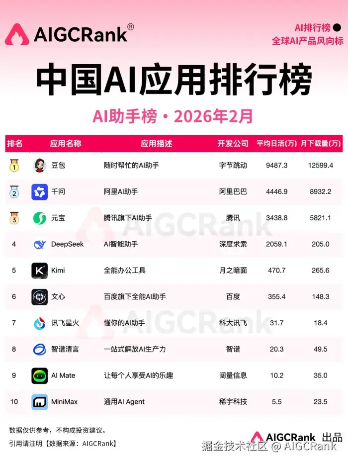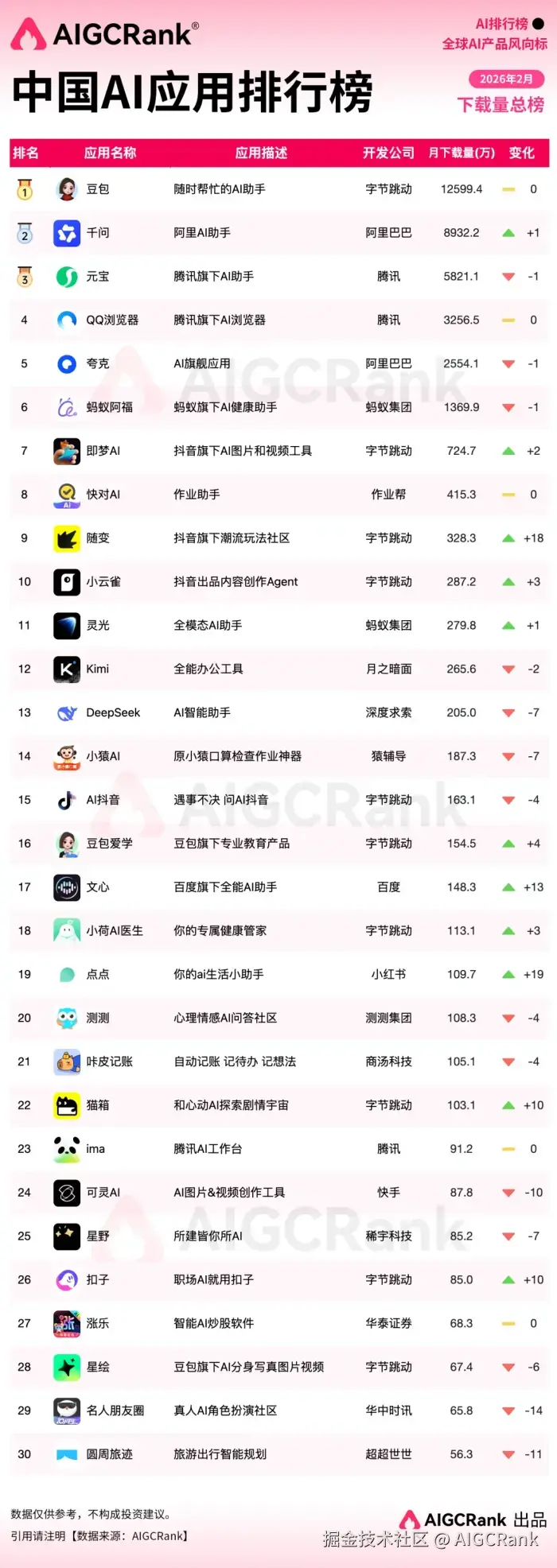 全球AI产品风向标 AI排行榜AIGCRank 今日权威发布2026年2月《中国AI应用排行榜》,榜单设置用户数、下载数排名两个总榜,及多个细分类型子榜单。AI排行榜由AIGCRank出品制作,基于国内主流App应用市场及算法备案平台数据,汇总300余款国内AI应用,综合评估其用户活跃度与影响力,持续追踪中国AI应用发展动态,为用户与从业者提供权威参考。