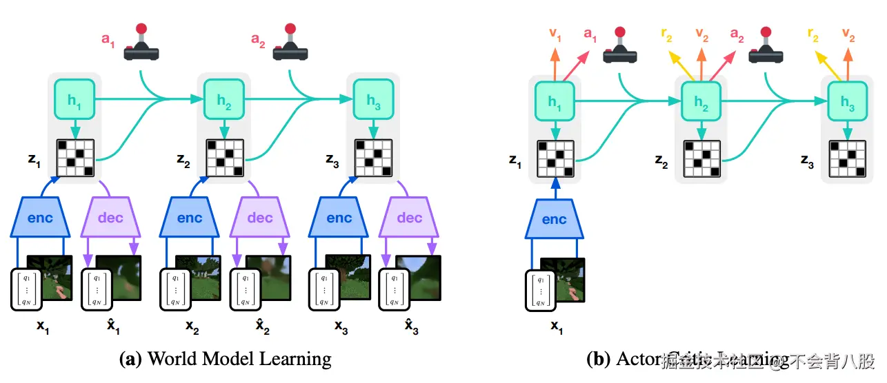DreamerV3的RSSM虽然高效,但其基于RNN的结构在捕捉长距离依赖和扩展模型容量方面存在瓶颈。Dreamer 4彻底拥抱了现代生成模型的架构:[Transformer],并结合了扩散模型的思想。
