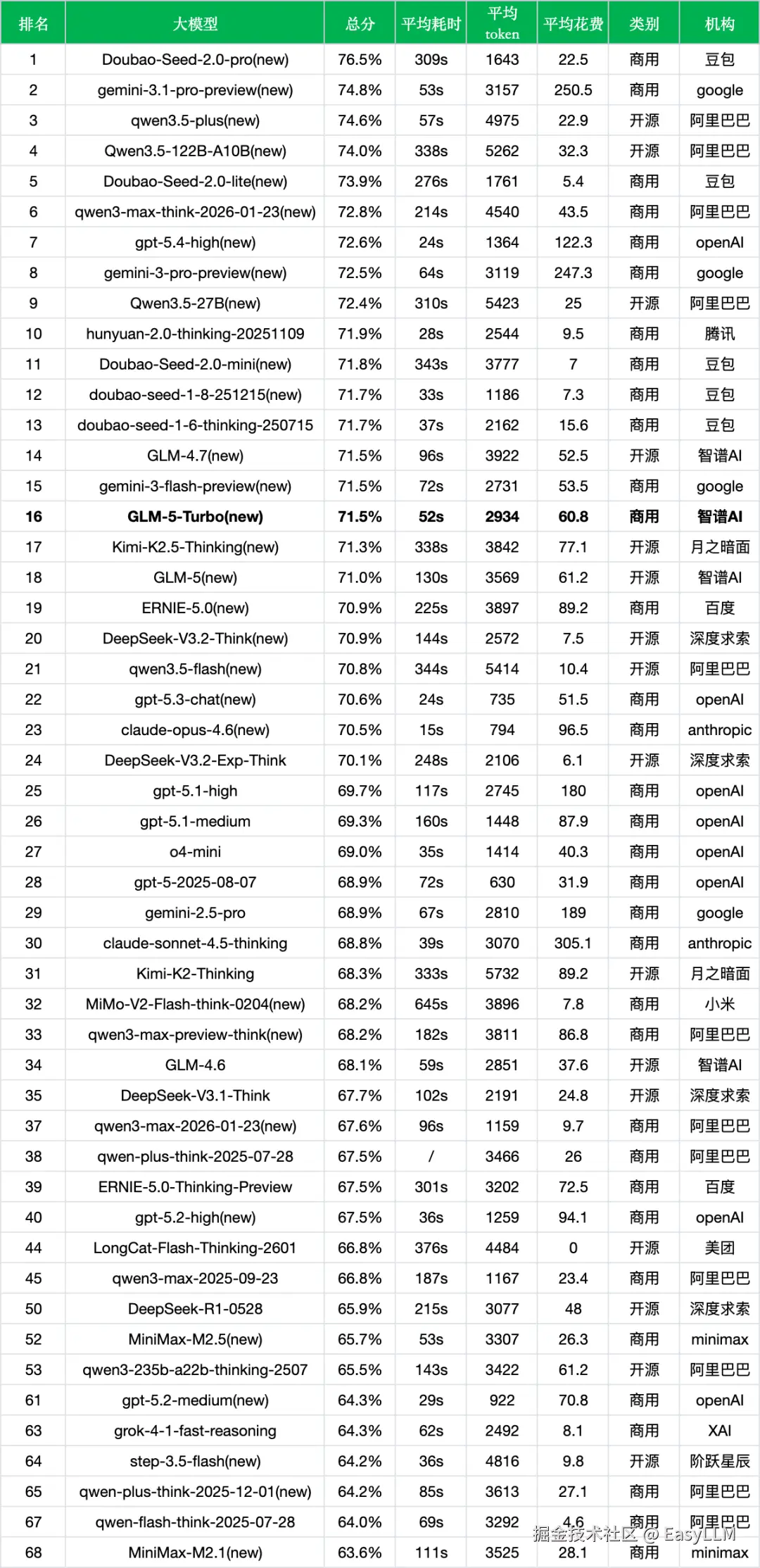 - 榜单头部格局:当前榜单前三由Doubao-Seed-2.0-pro(76.5%)、gemini-3.1-pro-preview(74.8%)和qwen3.5-plus(74.6%)占据,均为各家最新一代旗舰模型。GLM-5-Turbo排名第16位,在通用中文能力上与头部存在一定差距,但其核心价值更多体现在龙虾生态中的专项能力。