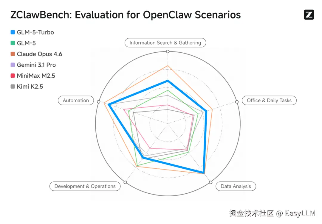 基于ZClawBench的评测结果显示,GLM-5-Turbo在OpenClaw场景中的表现相比GLM-5提升显著,在多项关键任务上整体领先于多家主流模型。