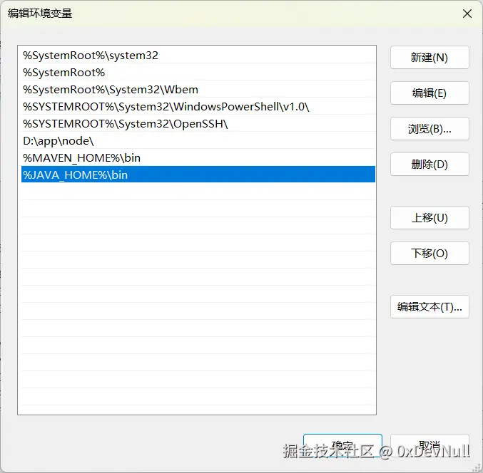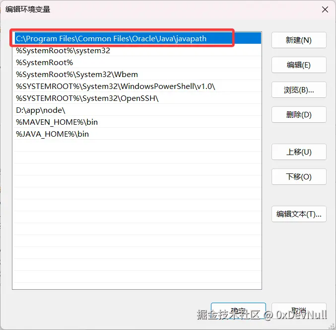 JDK 17 在安装时可能会自动配置环境变量。为避免冲突,需要在 Path 中删除以下自动添加的路径: