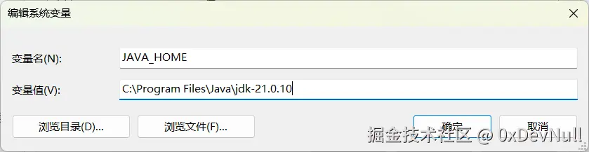 为了让系统能够识别并使用 JDK 21,需要配置环境变量。