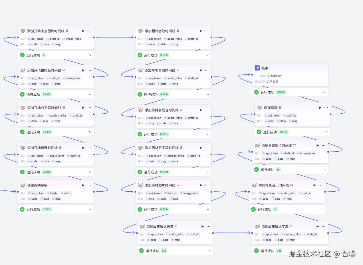 这部分节点的作用是把前面几个部分生成好的视频开头的动画时间线、语音时间线、字幕时间线、图片时间线都添加到剪映的草稿中。