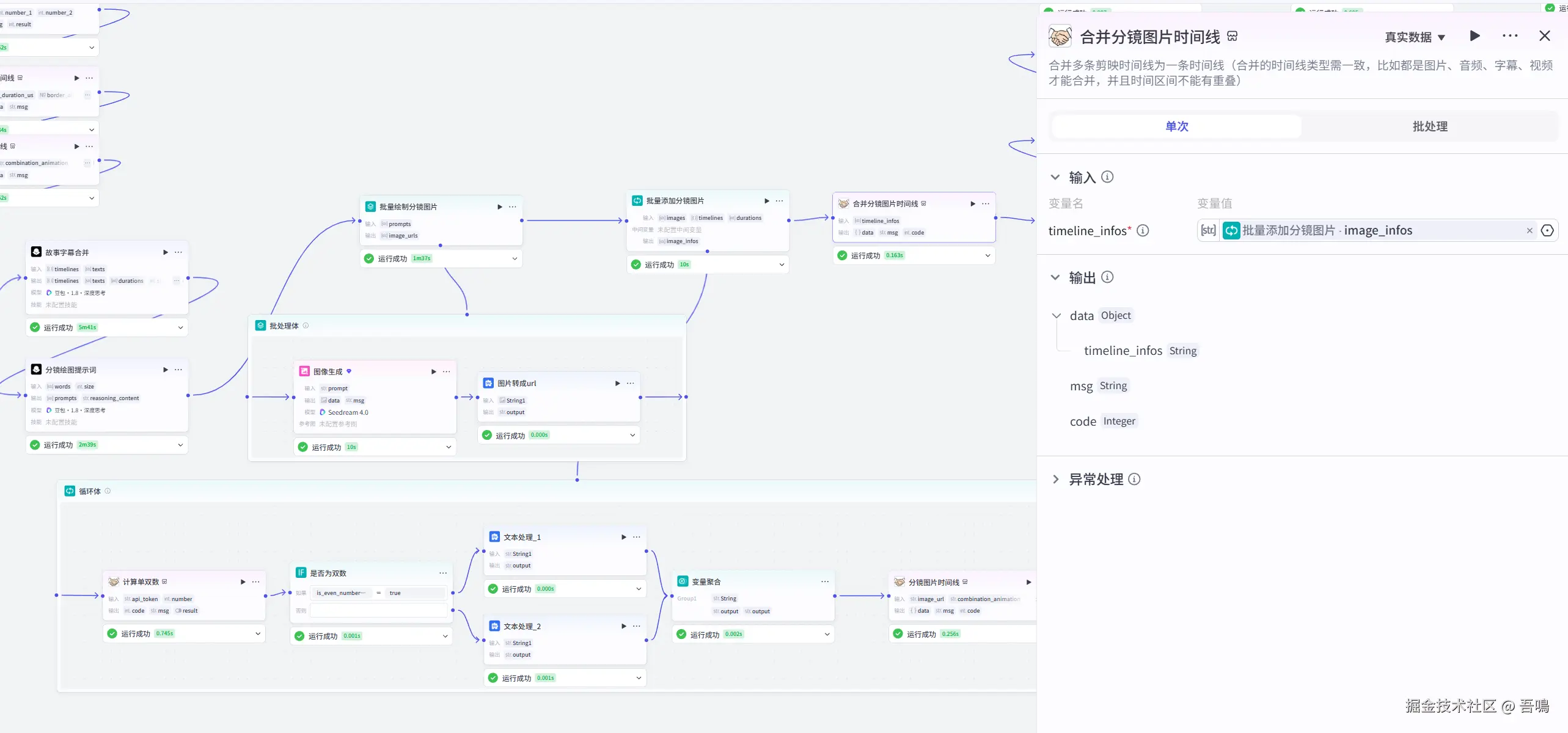 这个节点的作用是为了把很多剪映单独轨道上的图片时间线,合并到一条轨道上,使用到了扣子三方插件【视频剪辑工具箱】的【merge_timelines】工具。