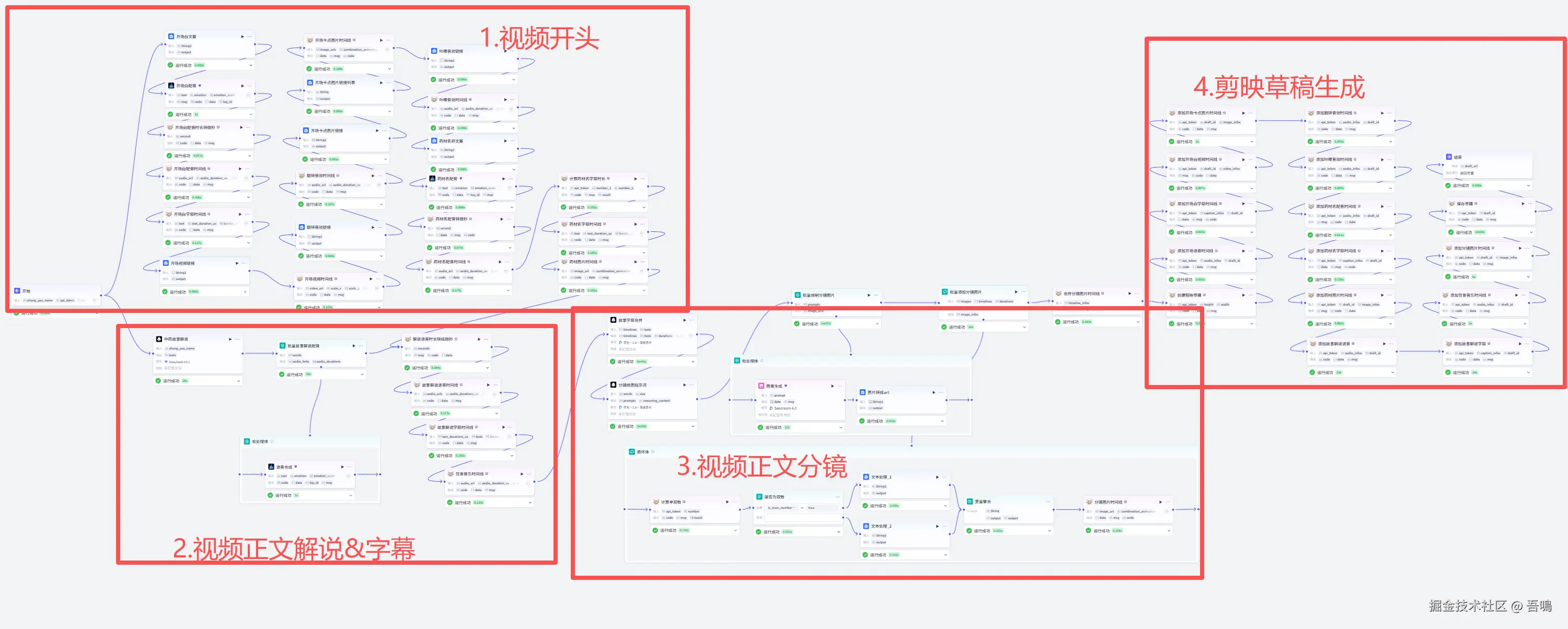 这个工作流我会把它拆分成视频开头、视频正文解说&字幕、视频正文分镜和剪映草稿生成四大部分,每一个部分都是由若干个节点组成来完成各自需要完成的任务。