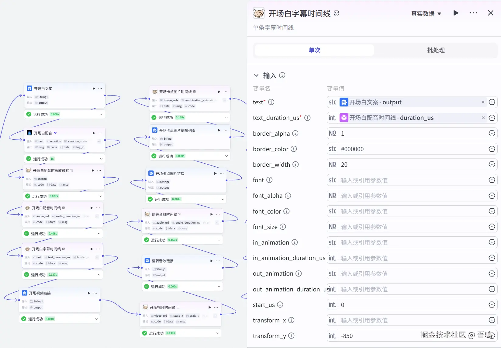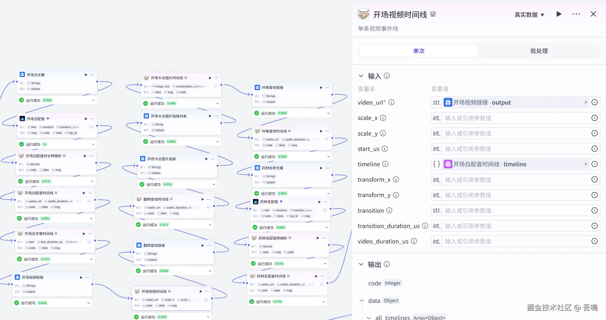 这个节点的作用是生成视频开头部分的动画的时间线,使用到了扣子三方插件【视频剪辑工具箱】的【single_video_timeline】工具。