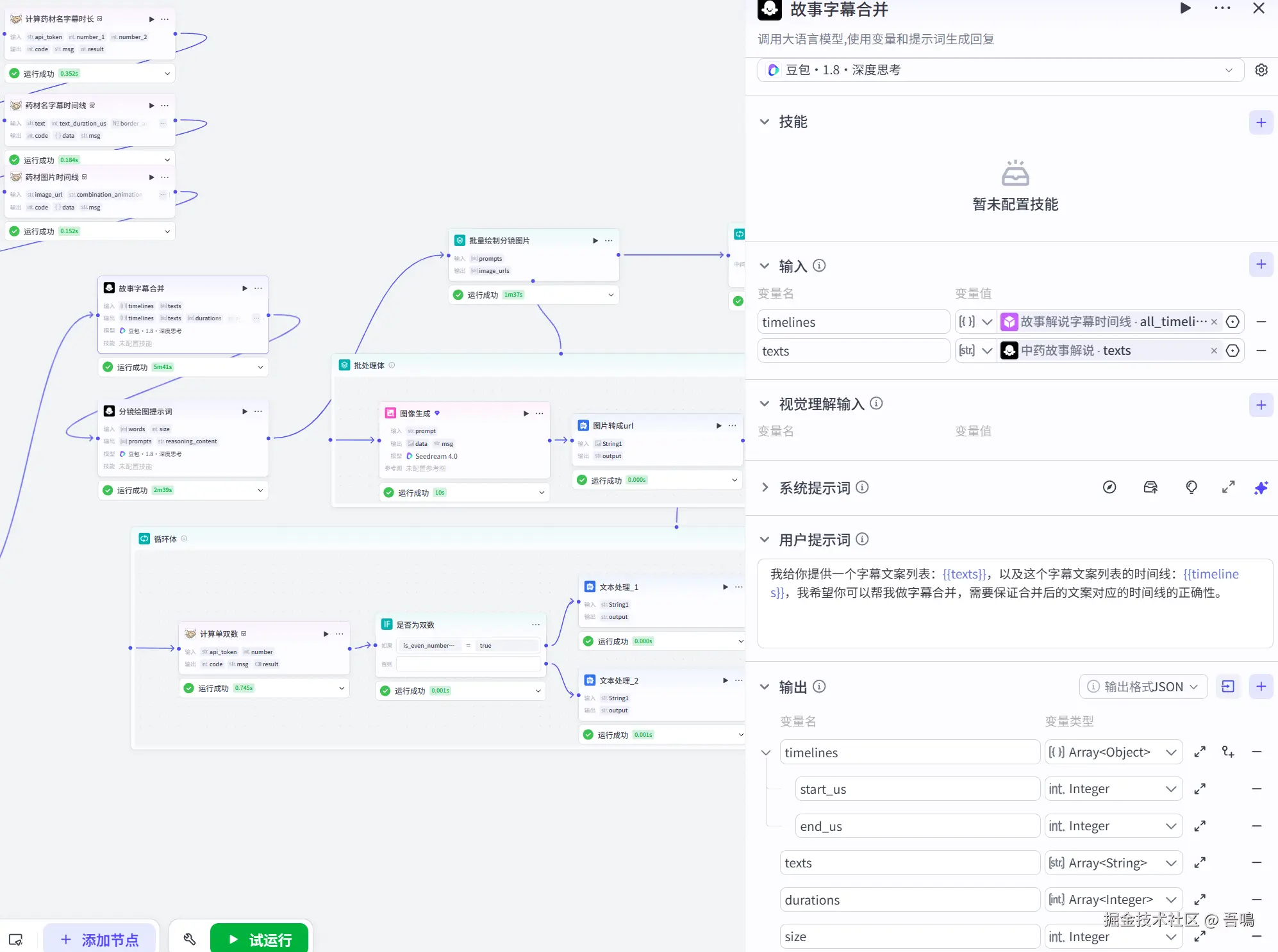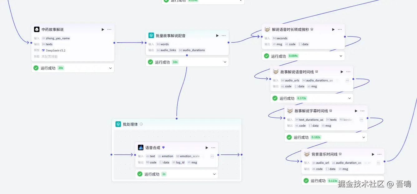 其他的节点基本上就是使用到了扣子官方的文本处理和语音合成插件,把内容按照剪映得时间线给拼接在一起。